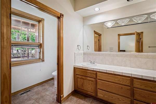 Laura Daniels, Team Pagosa Realty Group, C: 970-946-9281, laura@teampagosa.com, www.teampagosa.com: Custom single level dream home with expansive views of Pagosa peaks. First-choice lot and first house built at Pagosa Lakes Ranch, this home has the feeling of being in the woods, but is less than a mile from Uptown's great amenities: shopping, restaurants, City Market, and Pagosa Medical Center.The house is a beauty, freshly painted inside and out with the exterior wood sidingre-stained and protected. Thanks to its excellent airflow, high ceilings, and 32 windows, the entire house is light and bright. Lots of built-in storage drawers and cabinets throughout. Primary bathroom has an extra large roll-in shower built to ADA standards. Ramps are used for elevation changes. Two large decks extend the living spaces.The kitchen features a long wrap-around black granite countertop that lets the chef work easily on three sides. Picture this: your morning coffee while watching hot air balloons drift slowly skyward.A big "Bonus Room" (former garage) with half bath can be used for guests, a studio, workshop, or playroom. Just outside, the driveway curves like a horseshoe, so there's no need to back up. Opposite the three-car garage and expansive driveway, the hillside slope makes for fun sledding in winter, then becomes a seasonal pond for migrating birds and wildlife in the spring. You can live close to nature here and know that civilization has your back.