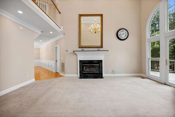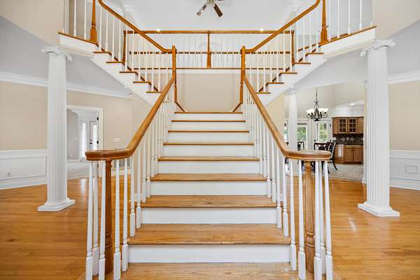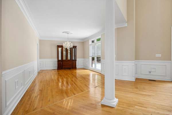 The heart of the home is a chef's kitchen with high-end appliances, double built-in ovens, and a custom coffee bar. A formal dining room and main-level laundry are also present.