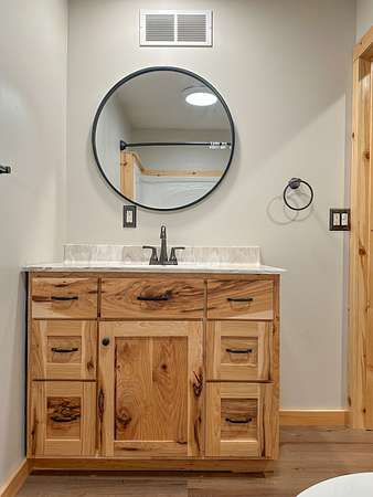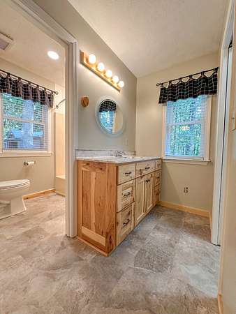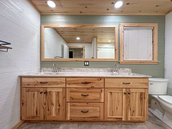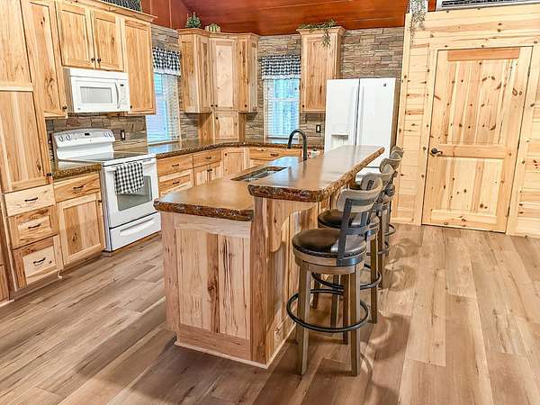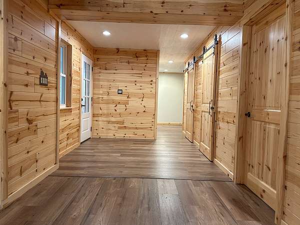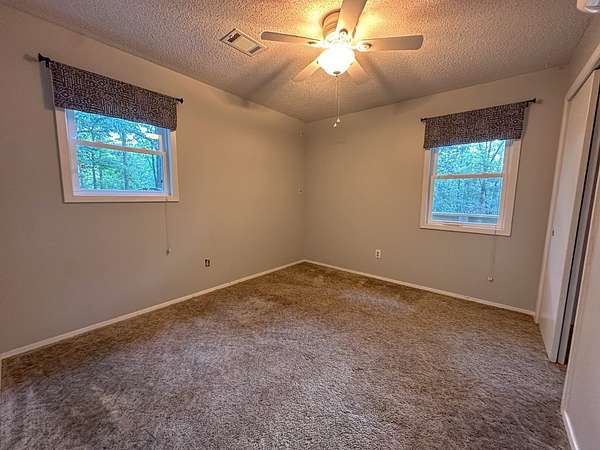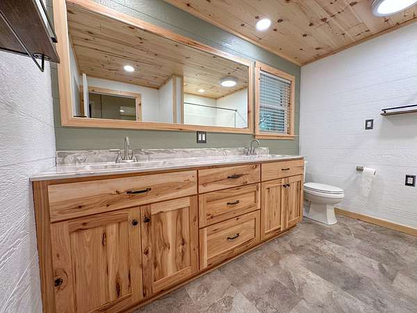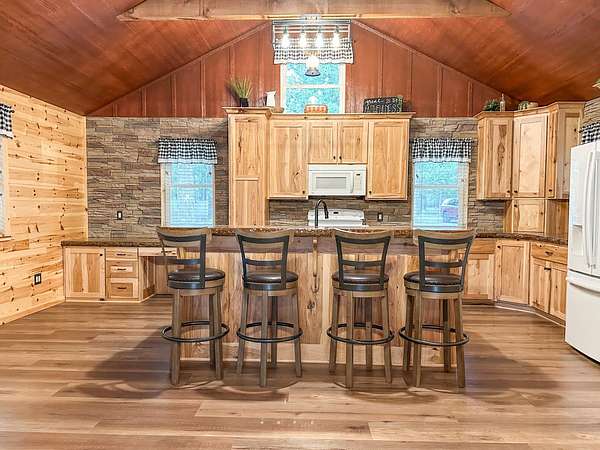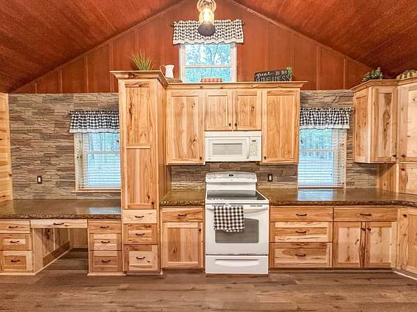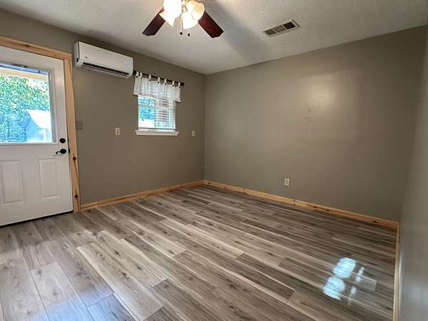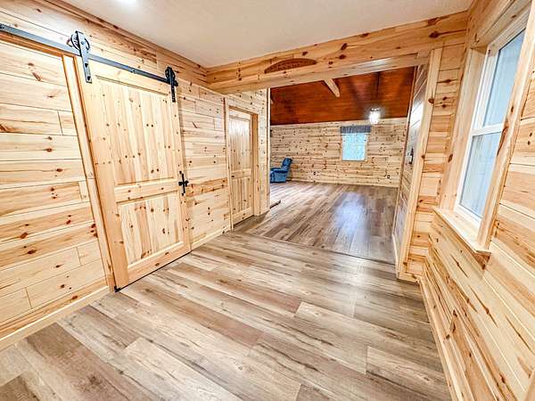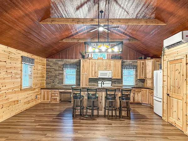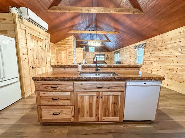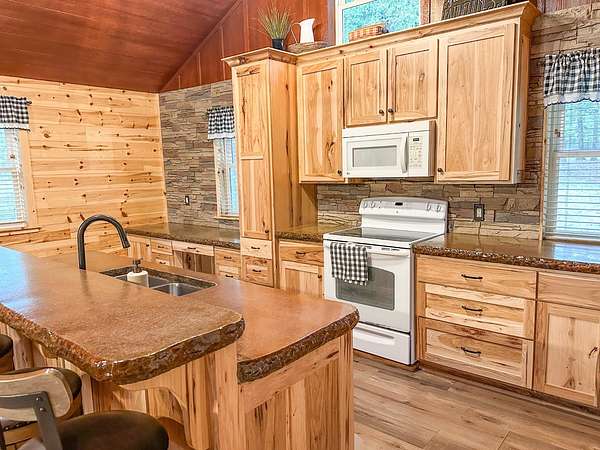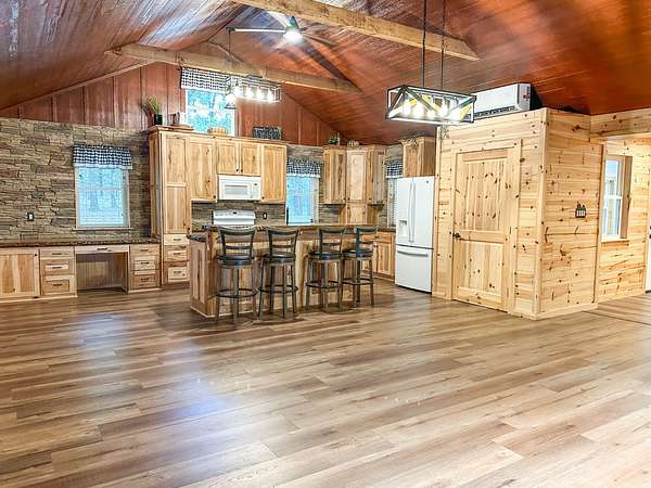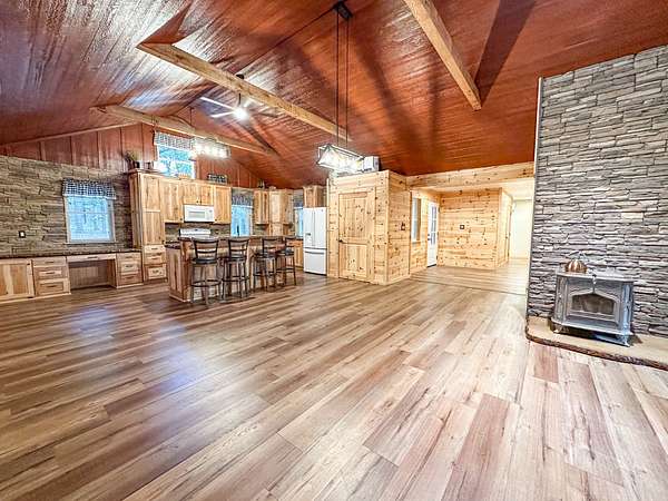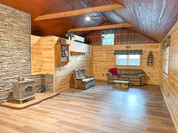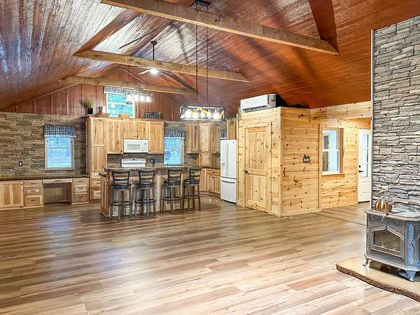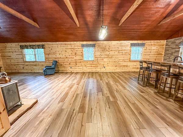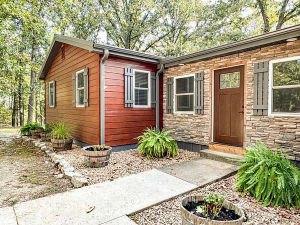 Nestled among tall trees in the serene country between Strawberry and Saffell, this spacious 4-bedroom, 3-bathroom home offers the perfect blend of rustic charm and modern updates. Originally built in 1983, the 2,232-square-foot residence was thoughtfully expanded and remodeled in 2024 to enhance both functionality and style. The home welcomes you with a cozy enclosed porch-ideal for kicking off shoes and hanging jackets-leading into a warm and inviting foyer. From there, the open-concept living room and kitchen create an airy, comfortable atmosphere. The kitchen is a true showpiece, featuring custom cabinetry, concrete countertops, a center island, stylish backsplash, and new appliances. It also includes a built-in desk or bar area, plus a walk-in pantry for added convenience. The living room continues the home's country aesthetic with beautiful tongue-and-groove wood walls and rustic ceiling. A wood stove set in a rock surround adds warmth and ties-in beautifully with the kitchen's design. Down the hall, you'll find a newly updated guest bathroom and ample storage closets. A secondary foyer leads to the private master suite, which includes a full bathroom and a walk-in closet. The remaining three bedrooms are located together and share a large, well-appointed guest bathroom. Outside, the 30x48 detached garage includes electricity and an exterior water spigot-ideal for projects, storage, and parking space.