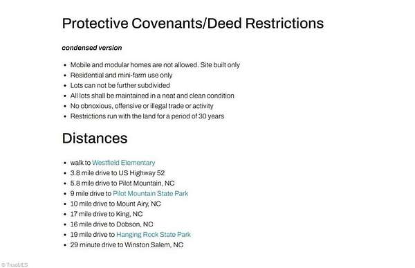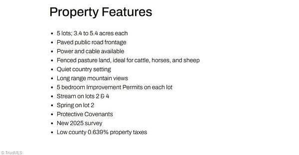 Est $899/mo5.4-acre (Lot #2) residential and mini-farm building lot in Surry County, NC. Gently sloping hay field with 260 feet of paved public road frontage and creek access. Approved for a new 5-bedroom septic system. Seller financing is available with no prepayment penalty. Protective covenants: no mobile or modular homes; site-built only, with no minimum square footage, preferred builders, or timeline to build. Just 6 miles to downtown Pilot Mountain and a 29-minute drive to downtown Winston-Salem. For more details, documents, interactive map, and watch video tour, please visit the listing agent's website