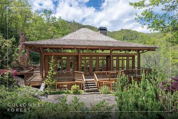 Hinoki House is a rare architectural offering in the Blue Ridge Mountains, where Japanese-inspired design and natural landscape exist in quiet balance. Set on more than 17 acres within gated Cullowhee Forest, the property offers privacy, riverfrontage, and a level of serenity increasingly difficult to find. A collaboration between the owners and MossCreek Designs, the four-bedroom, four-and-a-half-bath residence reflects the restraint and simplicity of traditional Asian architecture while embracing the scale and beauty of its mountain setting. Designed as a glass lantern with windows wrapping both levels, the home maximizes light and vertical space with ceilings of 12 feet or higher, expansive open-concept living, dining, and kitchen areas, and two main-level bedrooms with two-and-a-half baths. Floor-to-ceiling windows draw the outdoors in, framing views of a private waterfall, cascading water features, deep granite pools, and hundreds of feet of riverfrontage. Douglas fir lodge-pole framing, mulberry and cedar walls and ceilings sourced from the Pacific Northwest, and Brazilian cherry hardwood floors add warmth and craftsmanship throughout. The lower level includes two additional bedrooms, two bathrooms, a separate kitchen, a bonus room, and a laundry area, offering flexibility for guests or extended stays. Wraparound covered decks on both levels extend the living spaces outdoors, overlooking hiking trails, koi ponds, outdoor showers, Japanese gardens, a fire pit, and a dining gazebo - all set against sweeping mountain views. From the gorge to the mountaintop knoll, the landscape feels both expansive and deeply private. The estate includes a 6.37-acre primary lot and an 11.47-acre secondary parcel featuring a nearly level mountaintop knoll, ideal for a second dwelling. Well-loved and carefully maintained, Hinoki House represents a rarely available architectural retreat, where thoughtful design and irreplaceable natural setting converge. Cullowhee Forest provides a scenic private approach to this end-of-the-road property, along with a 75-foot waterfall, High Falls trail access, and fiber-optic internet. Located 25 minutes from Cashiers for shopping, dining, and recreation; 15 minutes from Lake Glenville and two restaurants with live music; approximately 60 miles from Asheville and its regional airport; and within a two- to three-hour drive of Atlanta, Charlotte, and Greenville.