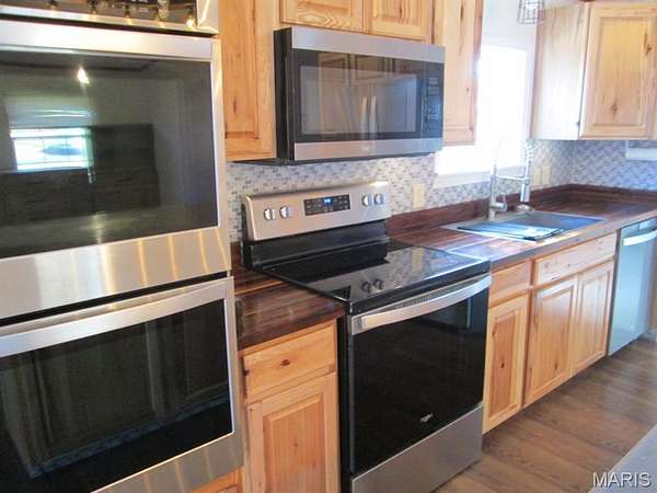 - Large kitchen with newer custom cabinetry and breakfast bar; Practically new SS kitchen appliances
