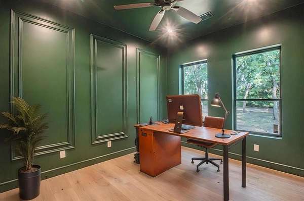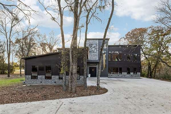 Welcome to an unparalleled masterpiece where modern luxury meets serene sophistication on 2.47 acres backing a private creek. This custom-designed smart home redefines elegance with soaring ceilings, Woodland Reserve Creekside Sawn White Oak wire-brushed hardwood floors, and quartz countertops throughout. The chef's kitchen boasts Zline appliances, including a 48" propane stovetop with double oven, 30" wall oven and microwave, double dishwasher, and under-cabinet beverage fridge, complemented by waterfall quartz countertops and matching backsplash. Two 32" KRAUS Bellucci granite composite sinks enhance functionality, while a walk-in pantry with a sink adds convenience. The main living area features a gas fireplace with built-in storage, a floor plug for flexible layouts, and a glass-enclosed wine cellar. Retreat to the master suite with a light-up ceiling, electric fireplace, and spa-like bathroom offering an Alpha bidet, dual shower with rain head, skylight, and stand-alone garden tub. Smart home technology, including Z-Wave switches, 5 alarm cameras, and 3 touchscreen control centers, allows seamless control of lights and thermostat. The media room, hidden behind a bookshelf door, boasts a 132" projector screen, 8K Ultra-HD receiver, and MartinLogan speakers, plus a beverage fridge and private balcony. Outside, a wood-burning fireplace warms the back patio, joined by an outdoor kitchen with a Traeger Timberland XL and kegerator. Titanium black quartzite stone, cedar siding, and black modern pebble landscaping frame the shingle-roofed estate, with a 3-car extended garage and custom black-trim windows. A 1,260 sq ft metal building with an 840 sq ft porch, pre-plumbed for a bathroom, offers endless possibilities. Experience luxury living with unmatched privacy and creek views. Schedule your private tour today!