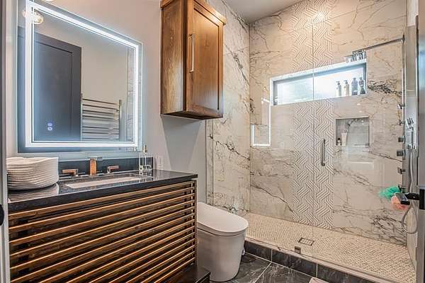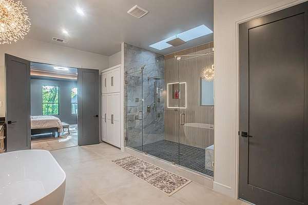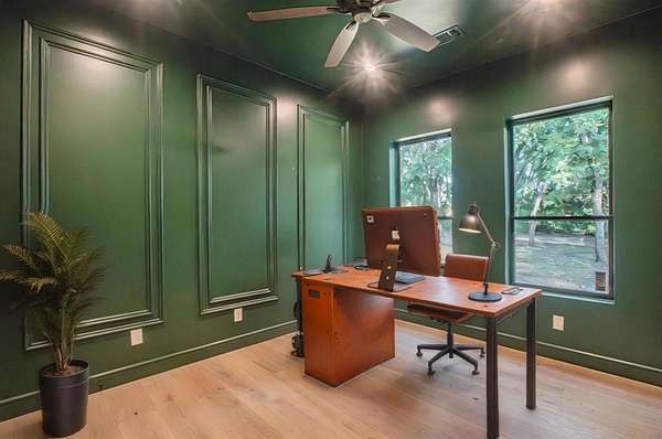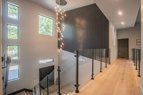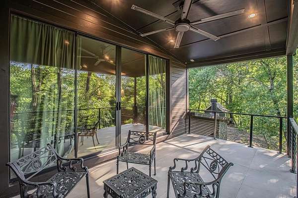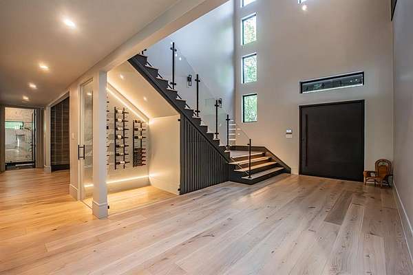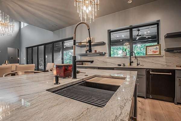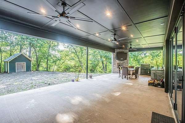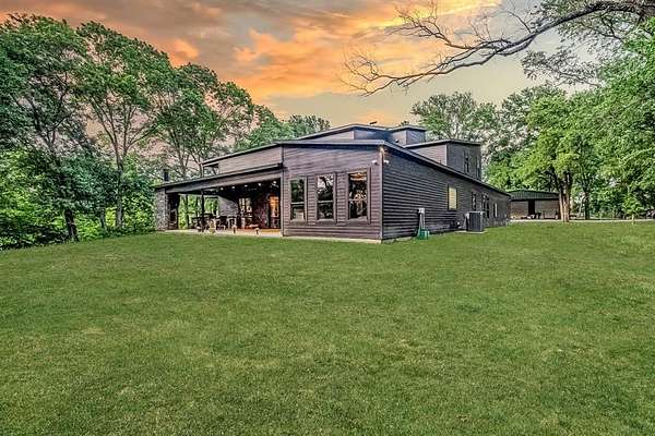 Welcome to an unparalleled masterpiece where modern luxury meets serene sophistication on 2.47 acres backing a private creek. This custom-designed smart home redefines elegance with soaring ceilings, Woodland Reserve Creekside Sawn White Oak wire-brushed hardwood floors, and quartz countertops throughout. The chef’s kitchen boasts Zline appliances, including a 48” propane stovetop with double oven, 30” wall oven and microwave, double dishwasher, and under-cabinet beverage fridge, complemented by waterfall quartz countertops and matching backsplash. Two 32” KRAUS Bellucci granite composite sinks enhance functionality, while a walk-in pantry with a sink adds convenience. The main living area features a gas fireplace with built-in storage, a floor plug for flexible layouts, and a glass-enclosed wine cellar. Retreat to the master suite with a light-up ceiling, electric fireplace, and spa-like bathroom offering an Alpha bidet, dual shower with rain head, skylight, and stand-alone garden tub. Smart home technology, including Z-Wave switches, 5 alarm cameras, and 3 touchscreen control centers, allows seamless control of lights and thermostat. The media room, hidden behind a bookshelf door, boasts a 132” projector screen, 8K Ultra-HD receiver, and MartinLogan speakers, plus a beverage fridge and private balcony. Outside, a wood-burning fireplace warms the back patio, joined by an outdoor kitchen with a Traeger Timberland XL and kegerator. Titanium black quartzite stone, cedar siding, and black modern pebble landscaping frame the shingle-roofed estate, with a 3-car extended garage and custom black-trim windows. A 1,260 sq ft metal building with an 840 sq ft porch, pre-plumbed for a bathroom, offers endless possibilities. Experience luxury living with unmatched privacy and creek views. Schedule your private tour today!