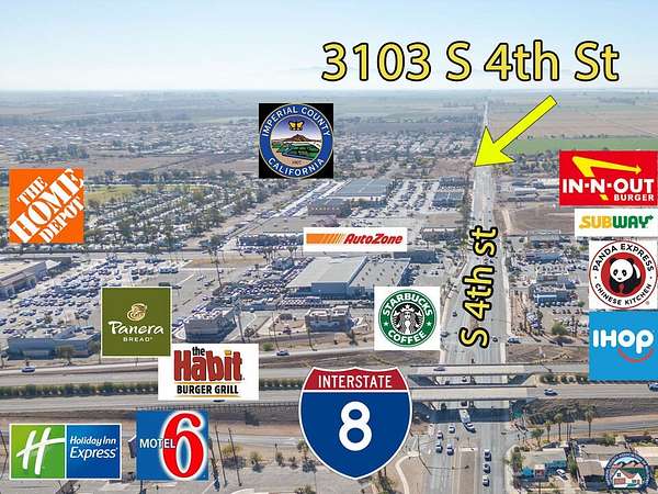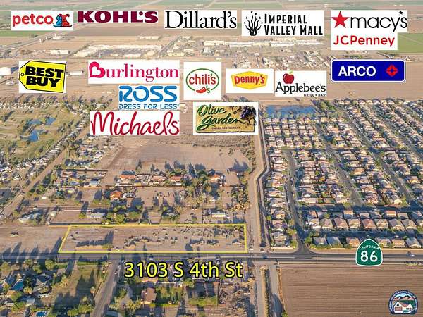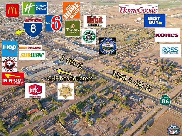 Situated on the last commercial property site on 4th Street in El Centro is 4.15 acres. This 4.15 acres is zoned Neighborhood Commercial and benefits from the housing in the area, plus all of the other substantial businesses in the area. Upon exiting from Interstate 8 onto south Hwy 86 aka 4th Street, you will find IHOP, Panda Express, In-N-Out, Habit, Panera Bread, Starbucks, Coyne Power Sports, Home Depot, AutoZone, Goodwill, Patriot Station, State Courthouse, truck stop & other retail, offices and auto dealers, Also, just north of the subject property at the corner of 4th Street/Danenberg Rd are another 6 buildings called Imperial County Center IV where another estimated 200 employees work at this site. Across the street is the new 30,000sf California Highway Patrol office, which construction is expected to be completed in November 2025. Neighborhood Commercial zoning supports a wide range of high-demand uses, including drive-through restaurants, medical and professional offices, and light services aligning with regional growth trends and expanding the property's versatility. Its proximity to major transportation arteries enhances market appeal, making it an attractive prospect for developers seeking long-term value appreciation in a dynamic market.