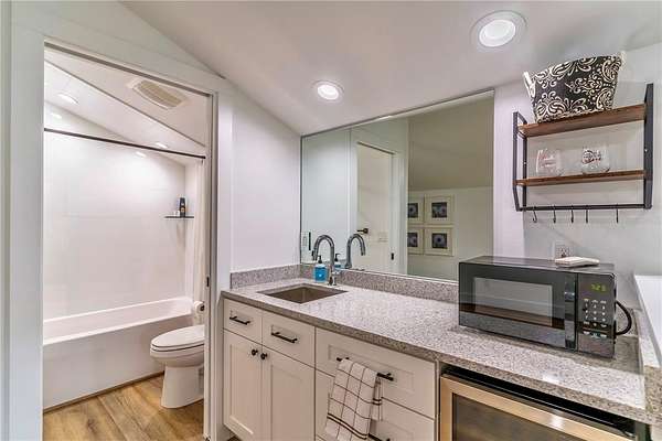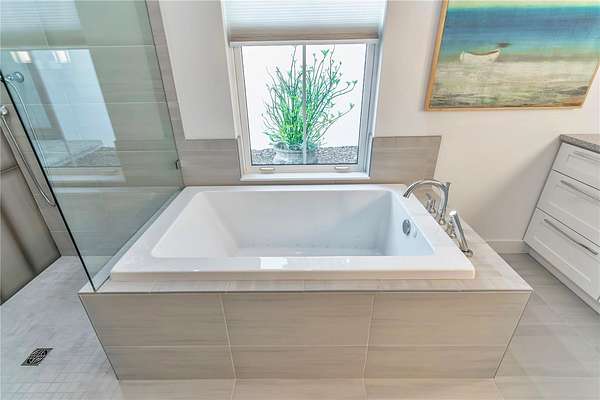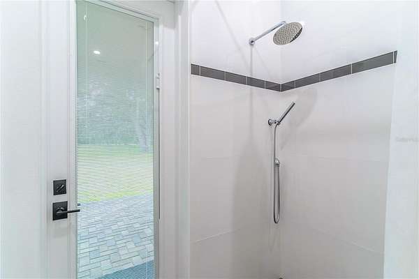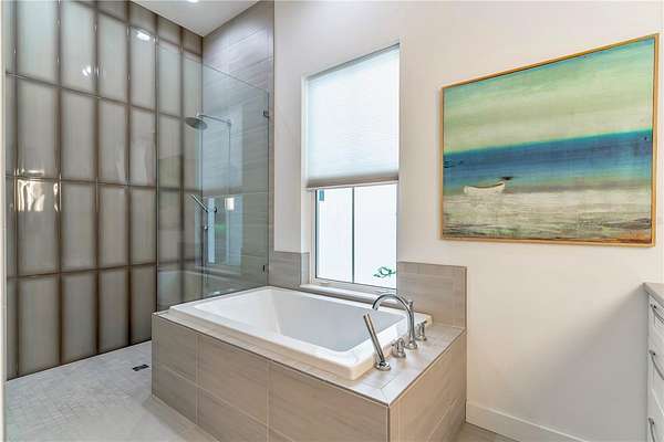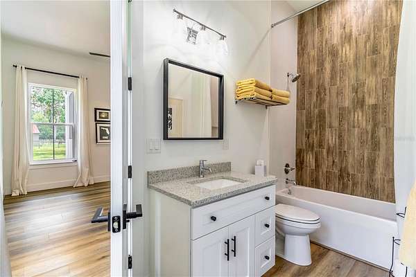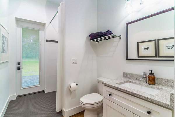 At the heart of the home, the chef’s kitchen is anchored by an oversized quartz island and equipped with a 5-burner gas cooktop, built-in oven, and pot filler—ideal for both everyday living and hosting. The luxurious primary suite offers direct porch access and features dual vanities, generous his-and-her closets, a deep soaking tub with air jets, a walk-in shower, and a private water closet. Two additional bedrooms share a Jack-and-Jill bath, while a third full bath provides convenient access to the outdoor living space. Both the primary and third bathrooms are thoughtfully designed for wheelchair accessibility.