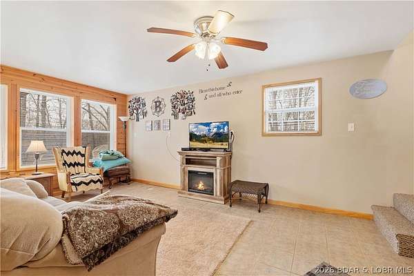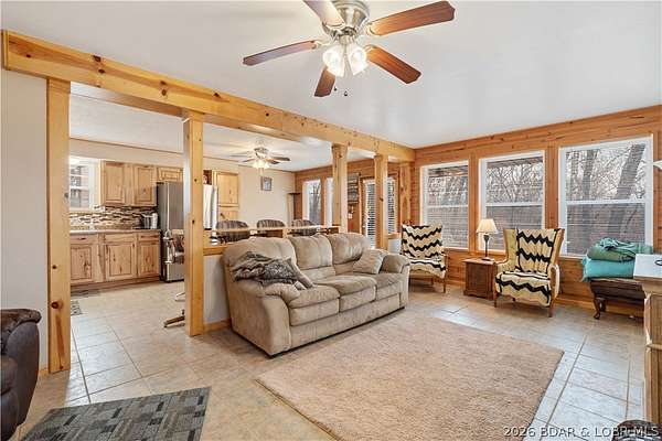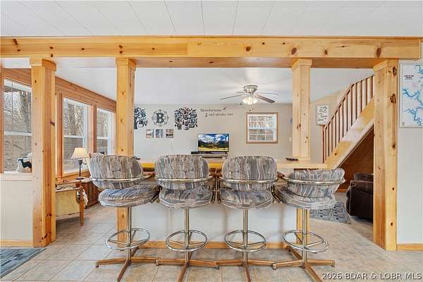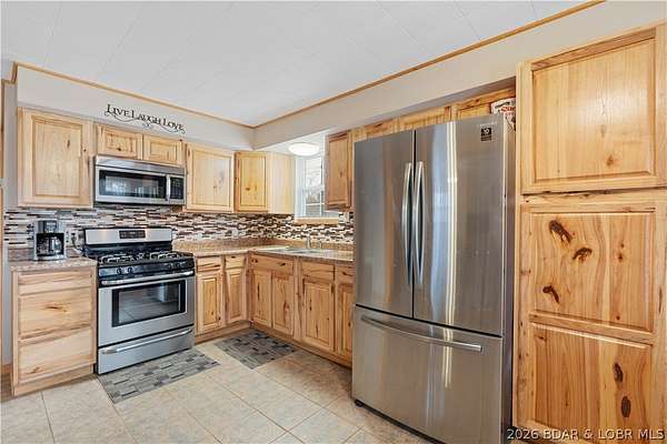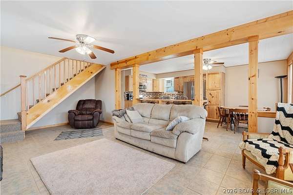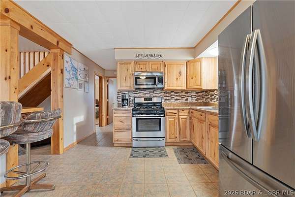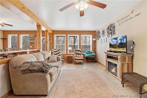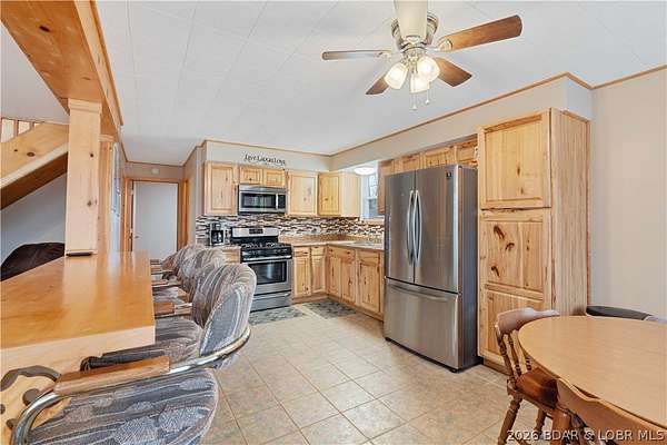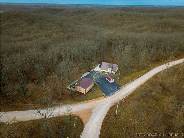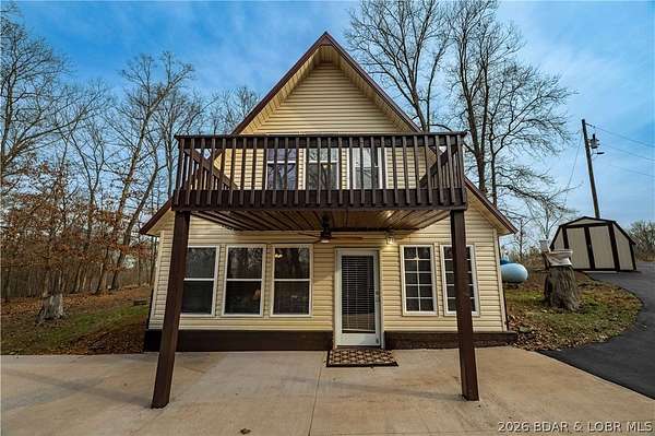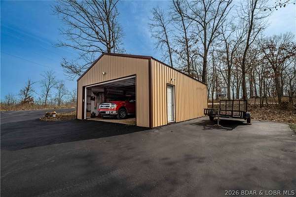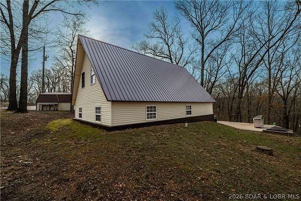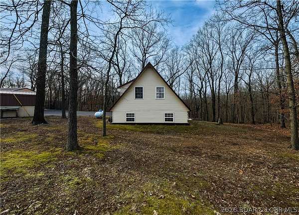 Discover this move in ready, A-Frame retreat @ Lake of the Ozarks positioned on a private, wooded setting just one mile off blacktop. This 4-bedroom, 1.5-bath home blends rustic charm w/ tiled floors, oak cabinets, stainless appliances including a propane gas cookstove plus ample storage & sleeping space for 8+ guests making it an ideal full-time residence, weekend escape, or high-performing vacation renta/fish campl. No-step entry adds everyday ease to all main living areas while upper-level primary suite features vaulted ceilings & private deck overlooking the Missouri outdoors where one can see frequent wildlife sightings-deer, turkey, & birds. Or gather around the fire pit & concrete patio after a day on the water. The large detached shop/man cave offers room for vehicles, a fishing boat, ATVs, and all your gear-perfect for hosting unforgettable fish fry weekends. Located just minutes from Wigwam Boat ramps or Patriots Marina, this property is ideal for anglers & lake lovers alike. No rental restrictions, strong short-term rental potential, metal roof, ample parking & peaceful surroundings, this turnkey property is the perfect Ozarks getaway & investment opportunity awaits.