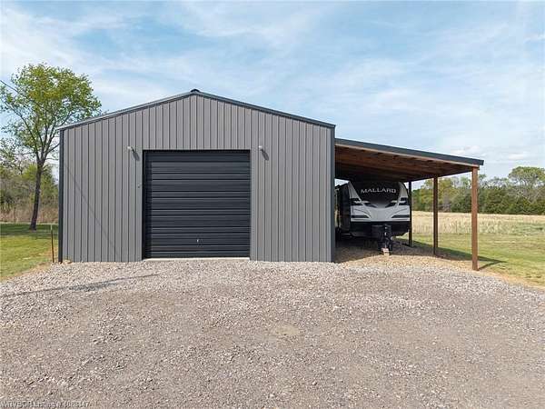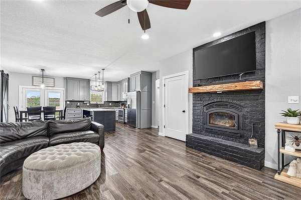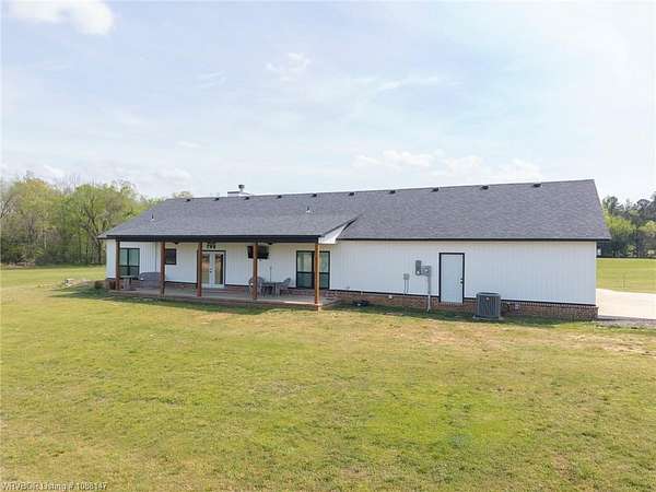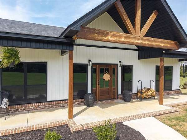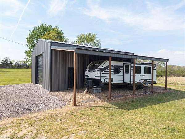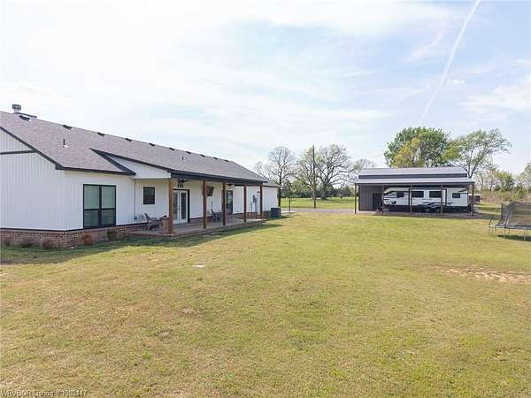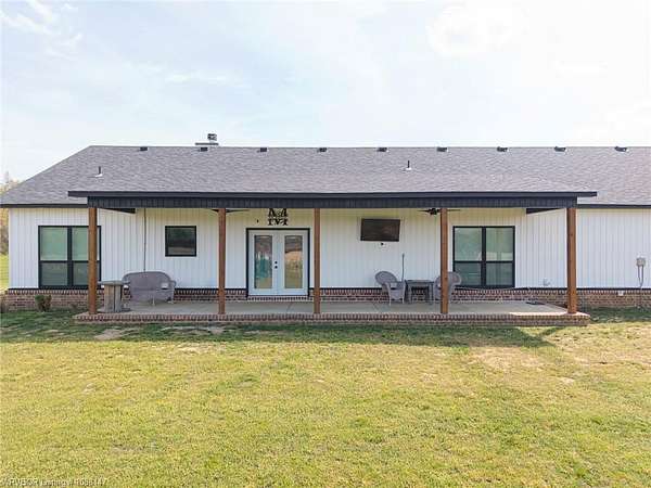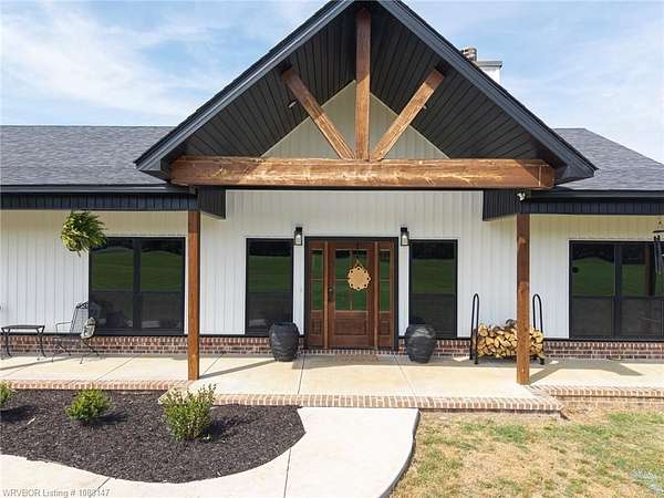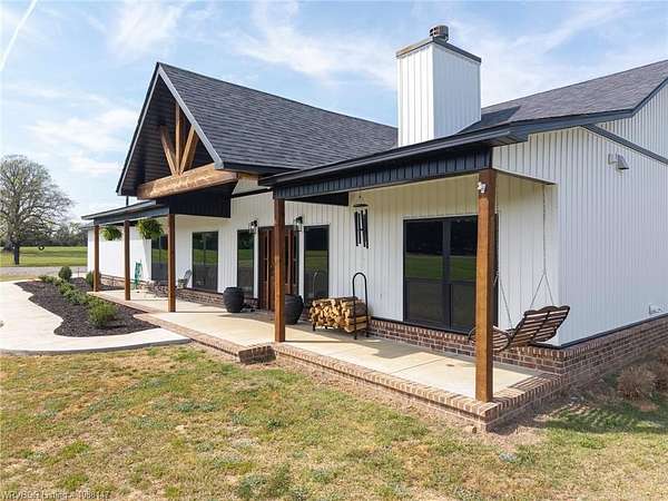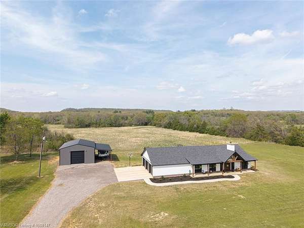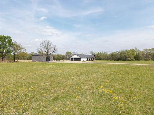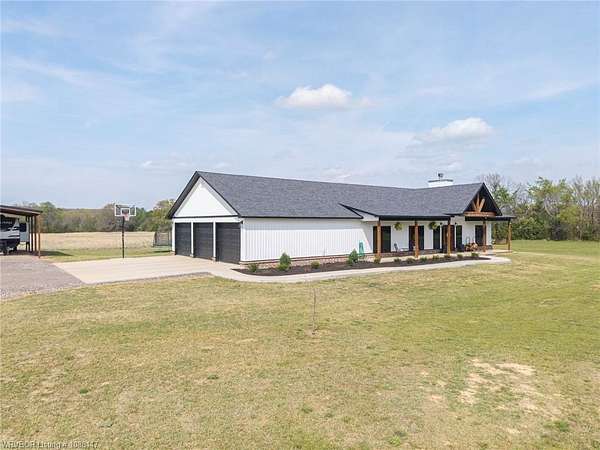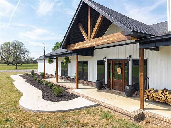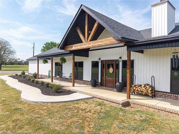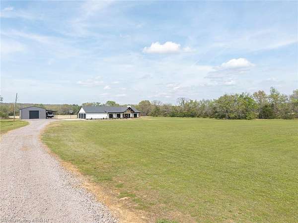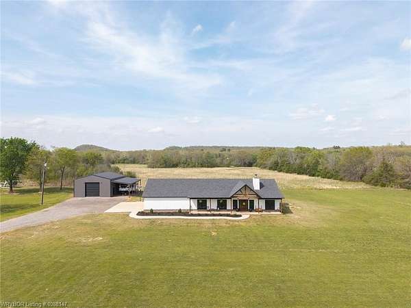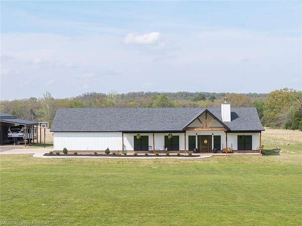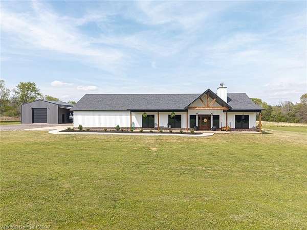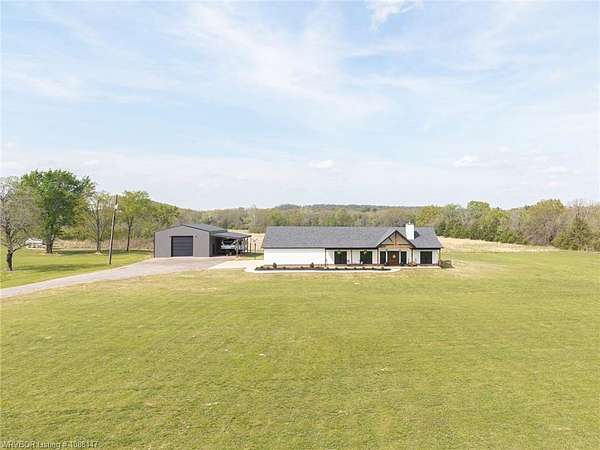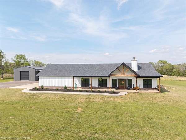 Beautifully designed modern farmhouse situated on approximately 8.5 acres, offering the perfect blend of comfort, functionality, and space. Conveniently located approximately 1 mile from the Arkansas/Oklahoma state line, this 4 bedroom, 2.5 bath home features an open-concept living, kitchen, and dining area with warm wood-look flooring and a wood-burning fireplace insert with blowers capable of heating the home. The kitchen is equipped with granite countertops, shaker-style cabinetry, stainless appliances, a large island with bar seating, and a walk-in butler's pantry for added storage and convenience. Bathrooms feature furniture-style vanities and thoughtful finishes throughout. The home is all electric for efficiency and ease of maintenance. The exterior showcases board and batten vinyl siding with brick accents and two oversized covered porches, ideal for enjoying the peaceful country setting. Recently added landscaping enhances the curb appeal. The 30x40 workshop is a standout feature, complete with a 16 ft lean-to, 30 amp RV hookup, and a full bathroom with tub/shower combo and washer/dryer hookups-perfect for guests, hobbies, or workspace. With wide open acreage, scenic views, and a functional layout both inside and out, this property offers the ideal balance of rural living and modern amenities. Listing Agent and sellers are related.