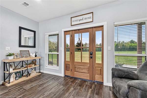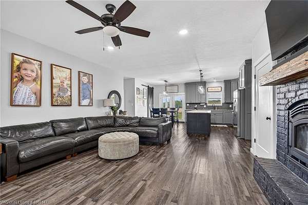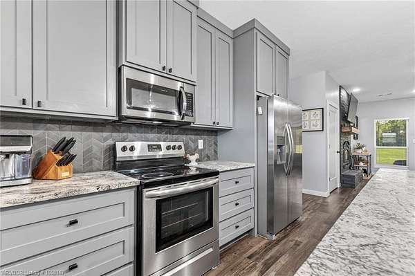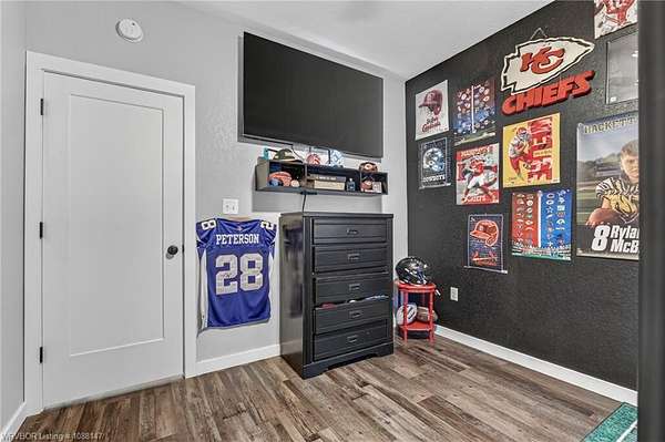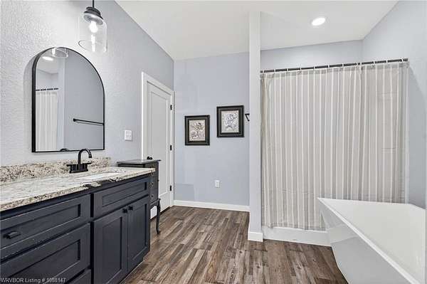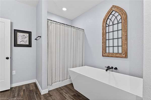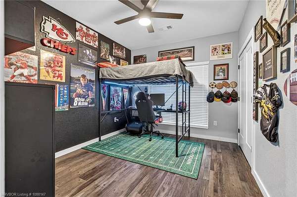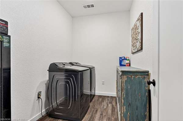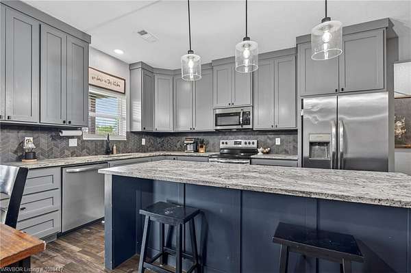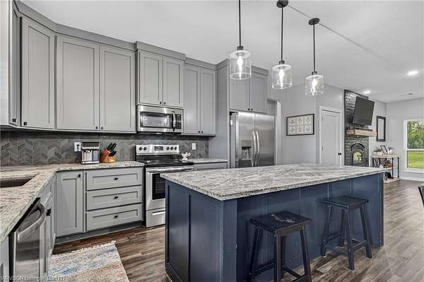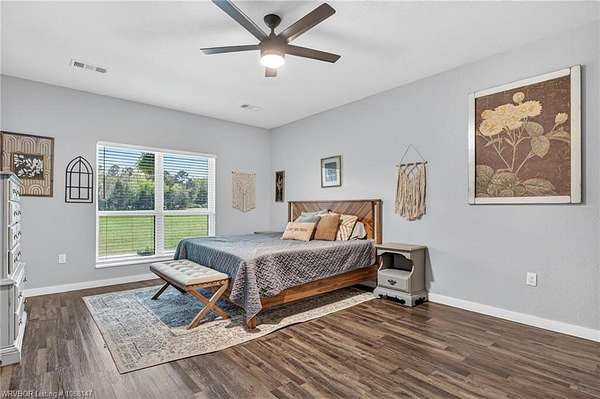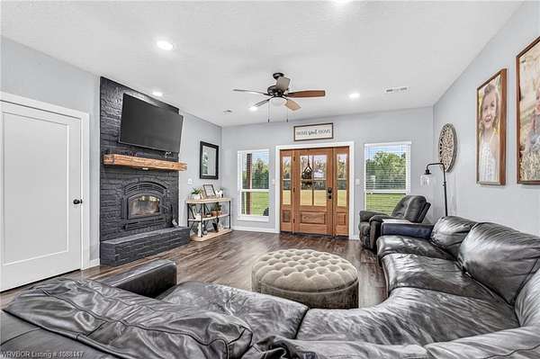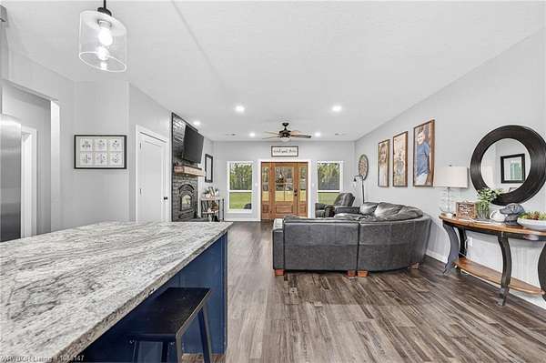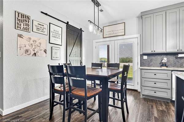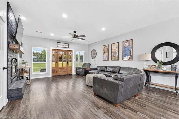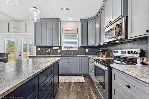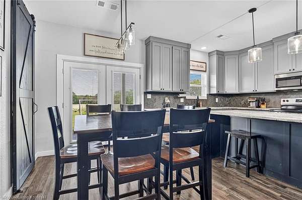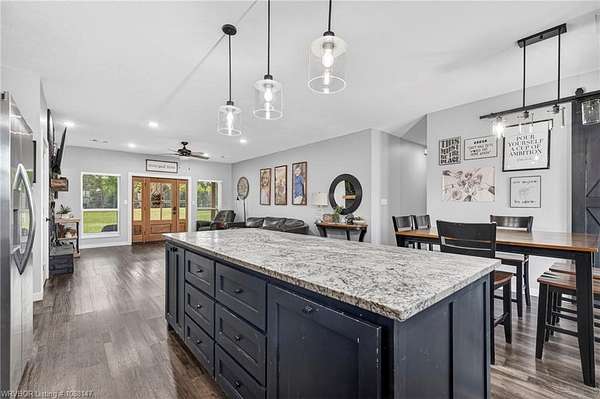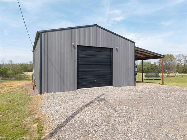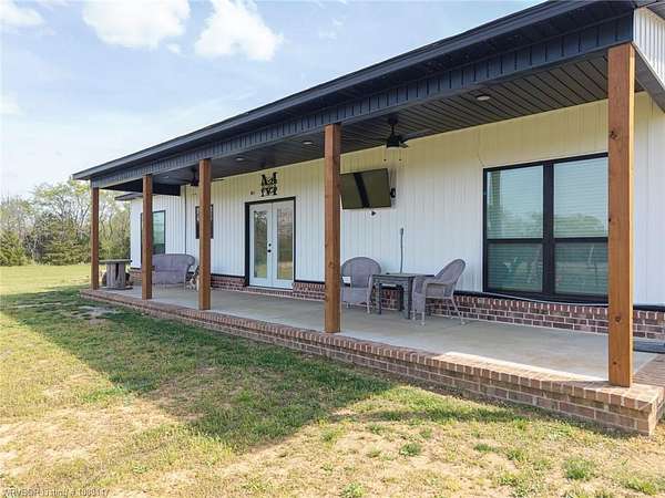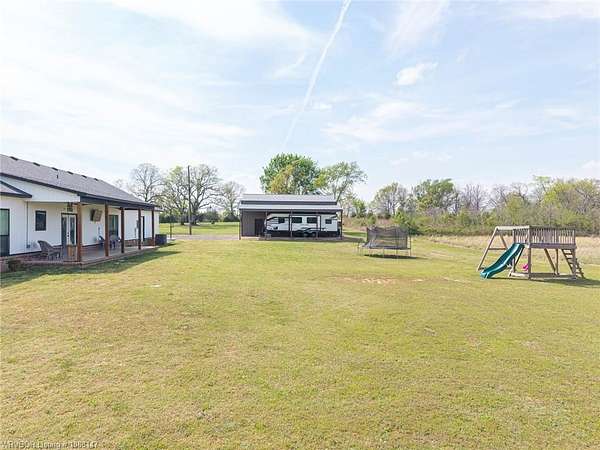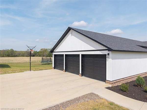 Beautifully designed modern farmhouse situated on approximately 8.5 acres, offering the perfect blend of comfort, functionality, and space. Conveniently located approximately 1 mile from the Arkansas/Oklahoma state line, this 4 bedroom, 2.5 bath home features an open-concept living, kitchen, and dining area with warm wood-look flooring and a wood-burning fireplace insert with blowers capable of heating the home. The kitchen is equipped with granite countertops, shaker-style cabinetry, stainless appliances, a large island with bar seating, and a walk-in butler's pantry for added storage and convenience. Bathrooms feature furniture-style vanities and thoughtful finishes throughout. The home is all electric for efficiency and ease of maintenance. The exterior showcases board and batten vinyl siding with brick accents and two oversized covered porches, ideal for enjoying the peaceful country setting. Recently added landscaping enhances the curb appeal. The 30x40 workshop is a standout feature, complete with a 16 ft lean-to, 30 amp RV hookup, and a full bathroom with tub/shower combo and washer/dryer hookups-perfect for guests, hobbies, or workspace. With wide open acreage, scenic views, and a functional layout both inside and out, this property offers the ideal balance of rural living and modern amenities. Listing Agent and sellers are related.
