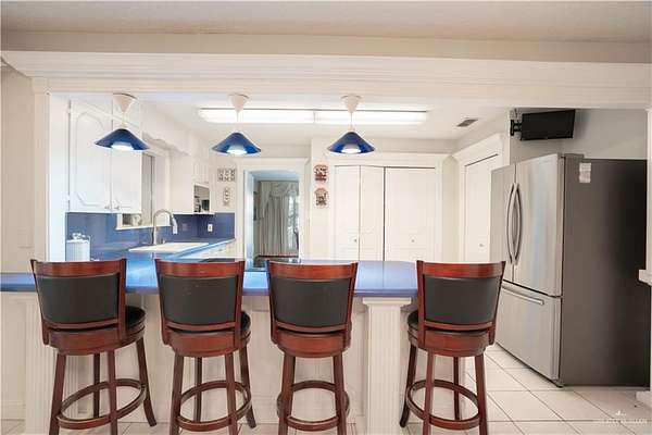 The heart of the home custom kitchen, complete with custom sapphire blue quartz countertops, a cozy breakfast bar--perfect for family meals or morning coffee.