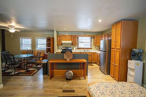 - Fireplace, Kitchen Island, Window Treatments