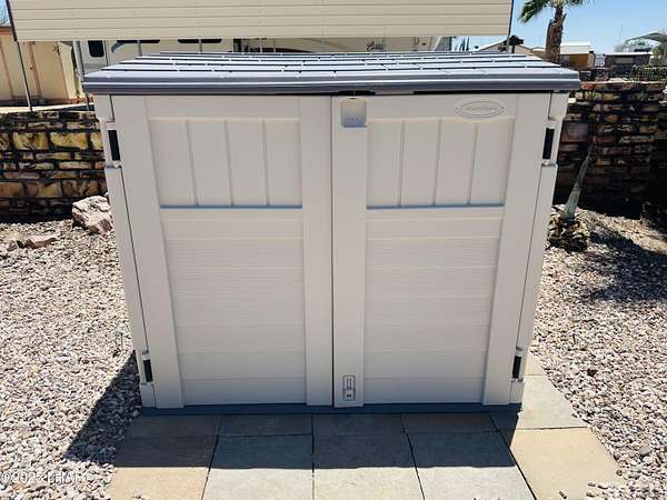 Beautifully landscaped corner lot with Casita/Garage and 2 full RV hookups, surrounded by Mexican brick on 3 sides located in West Park Resort Co-Op. Enjoy privacy on 3 sides of the lot, visual of the private, secured storage yard is perfect for storing a boat, 5th wheel, ATV's etc... The patio features a BBQ and a picnic table for entertaining and enjoying the breathtaking panoramic mountain views from your backyard and open desert skies around the firepit in the evenings. The Casita features 375sf of living space that includes a murphy bed, 3/4 bath with a walk-in shower and vanity, A/C unit, 40-gallon water heater, washer and dryer, full size refrigerator, shelves, tables and more. Fastnet equipment included. Call today to secure your new winter destination!