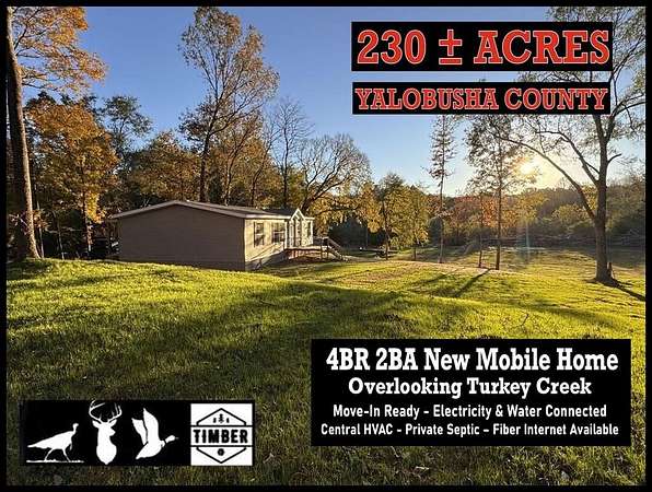 Turn-key ready hunting camp! New 4BR/2BA Mobile Home - deer, ducks, turkey, fish, & small game. The property has bottom land & pine ridges, food plots, plantation pines, big cypress, a solid road system, a wide creek, & even a duck hole to hunt & fish. Well known for the thriving deer population, it's loaded with turkeys. Between Water Valley & Coffeeville it's 30 miles S of Oxford & 25 miles E of I-55. Miles of roads traverse the property, & there's over 1,700 feet of paved frontage. A new 4BR 2BA mobile home with a covered back porch sits on a hill overlooking Turkey Creek. Utilities are connected & fiber internet is available. A heavy-duty bridge behind camp crosses Turkey Creek to drive equipment across & make quick drives to your blind. Hunt & fish, explore the creek, ride side-by-sides, dove hunt in September, watch wildlife from the porch, & make year-round memories at camp & in the woods. A great future timber investment with something for everyone to enjoy for years to come.