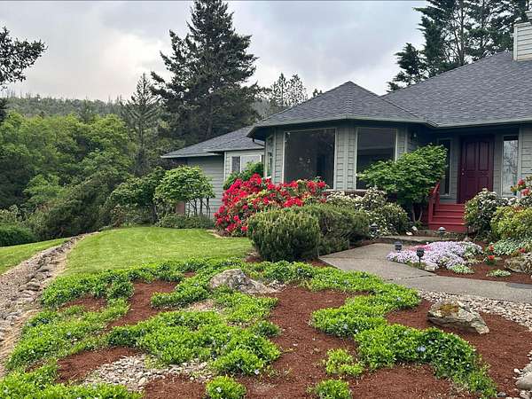From I-5 Exit 27: West on Garfield, left on Hwy 99. Right on S Stage, left on Voorhies. Left on Coleman Creek, go 2.2 mi past Pioneer, then left on Deer Trail Ln. Home on right.
