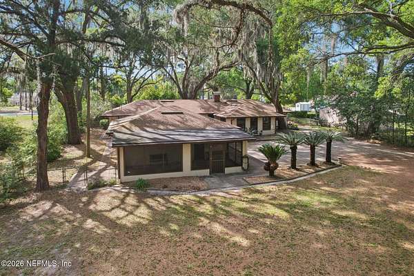 Rare opportunity to own over 2 acres with multi-generational potential and No HOA. Well cared for and full of charm, this split-bedroom layout features multiple common areas with private entrances, allowing for a variety of living options. Inside, you'll find a bright and cozy interior with wood flooring & new paint throughout. The updated kitchen with an eat-in area and breakfast bar, opens to a sitting area and living room centered around a wood-burning fireplace. Lush, mature landscaping with established Oaks and blooming azaleas creates a private, garden-like setting across the front yard. A covered patio plus two pavered outdoor patios provide multiple private spaces to relax and enjoy the peaceful, fully fenced, tree-line back yard. Additional parking and oversized 2-car garage with built-in workspace provide convenience and function. Major recent updates include new roof in 2023 and HVAC in 2022 adding peace of mind for years to come. With a generous lot size, central location near major roadways, shopping, and dining, this property offers space, privacy, and flexibility in a well-established setting.