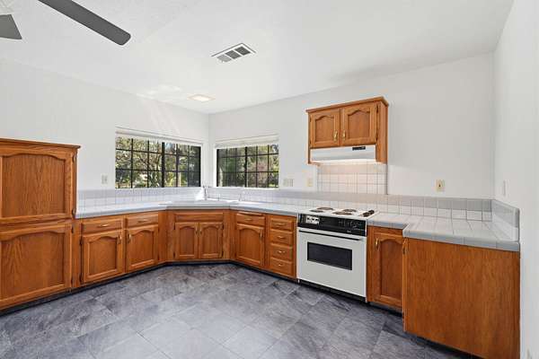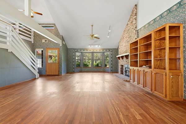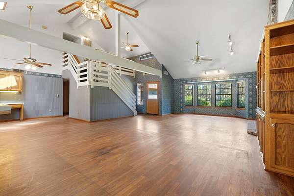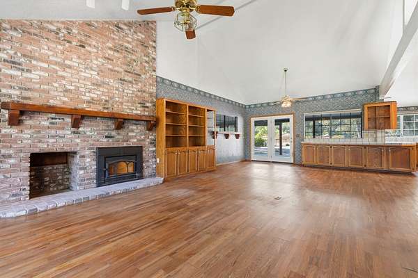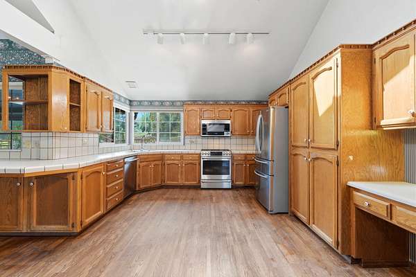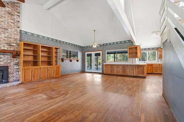 - Beamed Ceilings, Bookcases, Built-In Features, Ceiling Fan(s), High Ceilings, Kitchen Open to Family Room, Open Floorplan, Tile Counters, Track Lighting, Vaulted Ceiling(s)