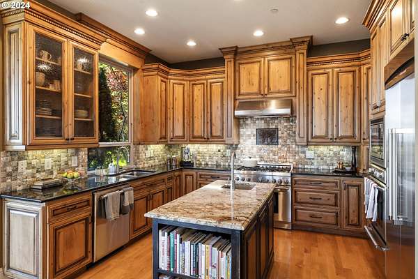 - Appliance Garage, Builtin Oven, Butlers Pantry, Cook Island, Dishwasher, Disposal, Double Oven, Free Standing Gas Range, Granite, Instant Hot Water, Island, Microwave, Pantry, Plumbed For Ice Maker, Range Hood, Stainless Steel Appliance