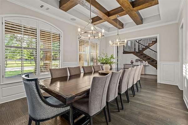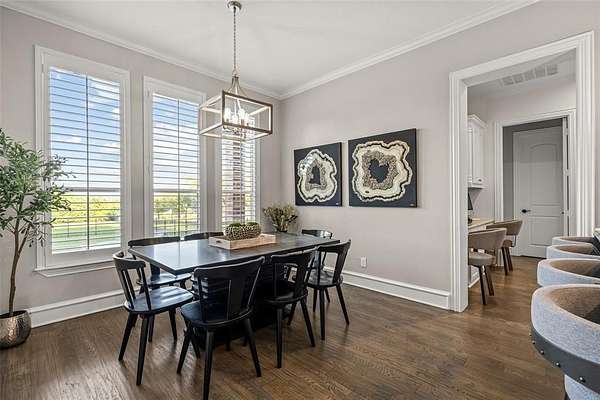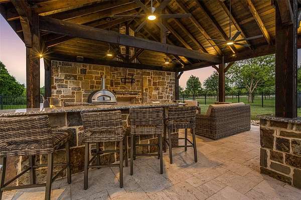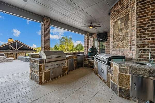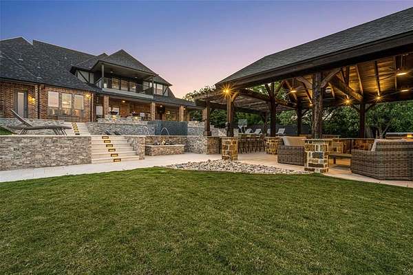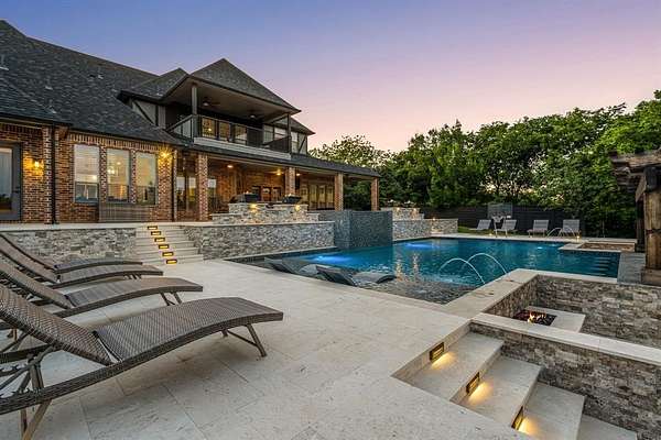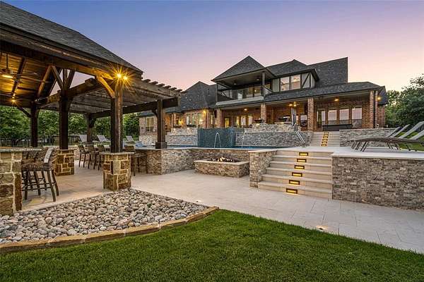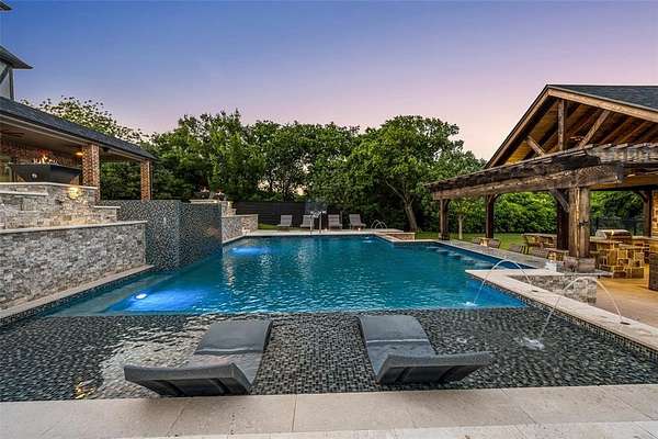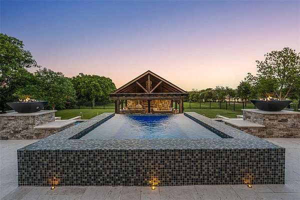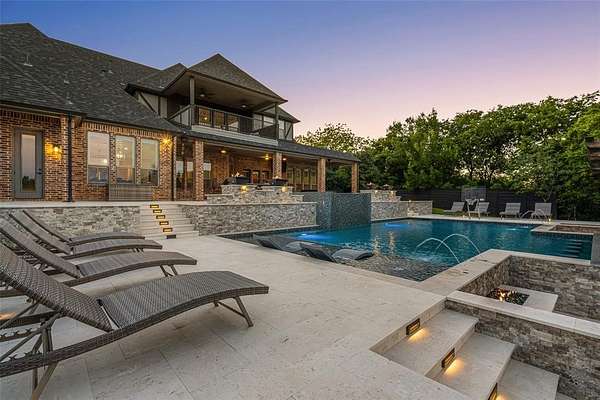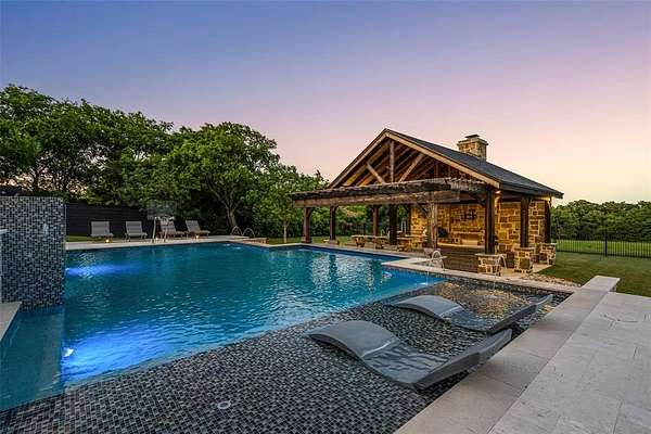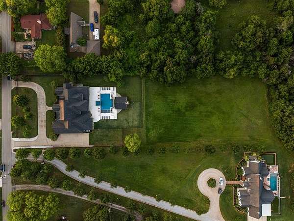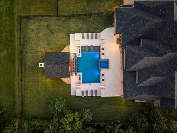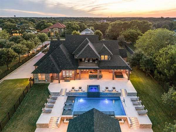 Set on nearly 2 private acres, this Maykus gated custom home offers privacy and tranquility, backing to Corps of Engineers land and just minutes from Lake Grapevine. The inviting dining room features wood beam ceilings and comfortably seats up to fourteen, ideal for both intimate dinners and large gatherings. The heart of the home is the gourmet kitchen, anchored by an expansive island and equipped with new Dacor refrigerator, dual dishwashers and a new Thermador range. It opens seamlessly to the family room, where a warm fireplace and scenic backyard views create a welcoming space for everyday living. Each bedroom includes its own ensuite bath, providing comfort and privacy for family and guests. Additional living spaces include a spacious game room and media room, perfect for entertaining. The primary suite is generously sized, featuring a well appointed bath and custom closet. Step outside to a true backyard retreat, complete with a sparkling pool and spa. The backyard is nothing short of a private resort. A sparkling pool and spa anchor the space, while a beautifully designed cabana with ample seating, a fireplace, and a pizza oven invites long, unforgettable evenings. Whether it’s a lively gathering or a quiet night under the stars, every detail has been designed to elevate the experience. This home doesn’t just live beautifully. it feels effortless, timeless and deeply connected to its surroundings.
