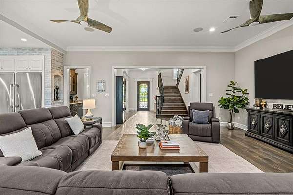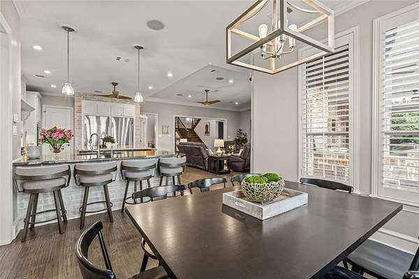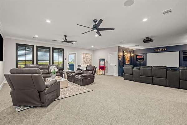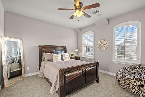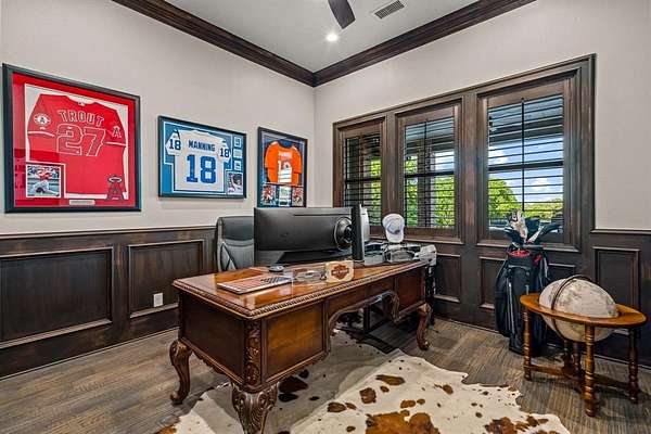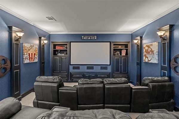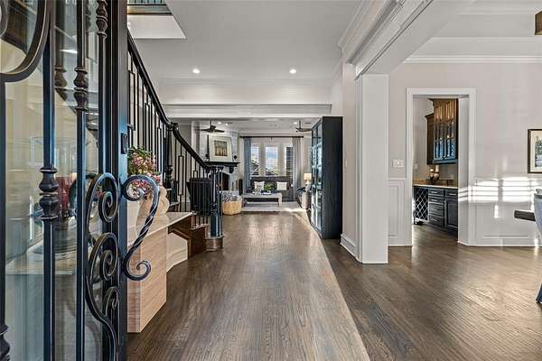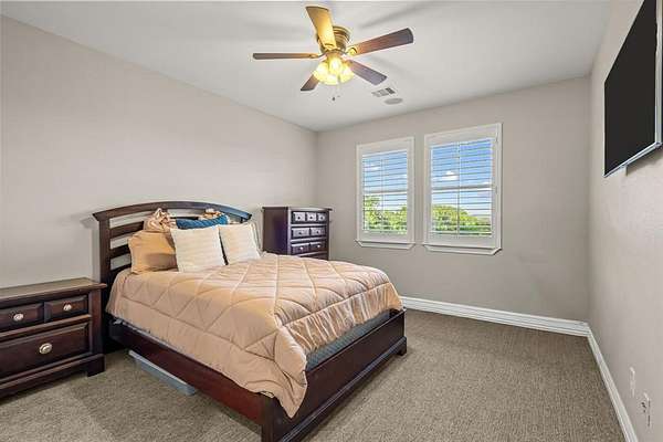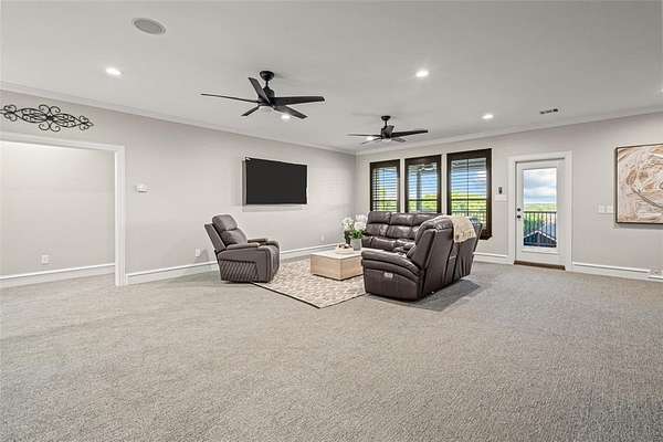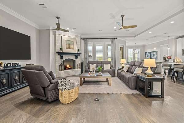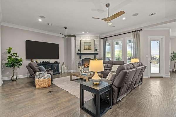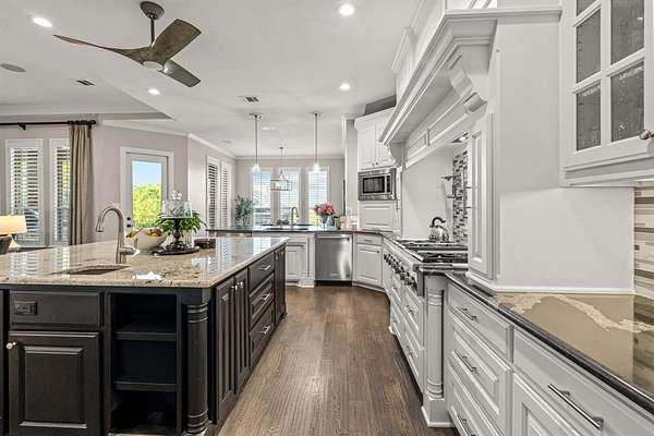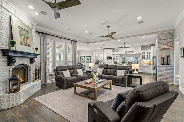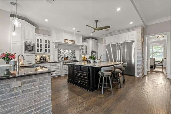 Set on nearly 2 private acres, this Maykus gated custom home offers privacy and tranquility, backing to Corps of Engineers land and just minutes from Lake Grapevine. The inviting dining room features wood beam ceilings and comfortably seats up to fourteen, ideal for both intimate dinners and large gatherings. The heart of the home is the gourmet kitchen, anchored by an expansive island and equipped with new Dacor refrigerator, dual dishwashers and a new Thermador range. It opens seamlessly to the family room, where a warm fireplace and scenic backyard views create a welcoming space for everyday living. Each bedroom includes its own ensuite bath, providing comfort and privacy for family and guests. Additional living spaces include a spacious game room and media room, perfect for entertaining. The primary suite is generously sized, featuring a well appointed bath and custom closet. Step outside to a true backyard retreat, complete with a sparkling pool and spa. The backyard is nothing short of a private resort. A sparkling pool and spa anchor the space, while a beautifully designed cabana with ample seating, a fireplace, and a pizza oven invites long, unforgettable evenings. Whether it’s a lively gathering or a quiet night under the stars, every detail has been designed to elevate the experience. This home doesn’t just live beautifully. it feels effortless, timeless and deeply connected to its surroundings.