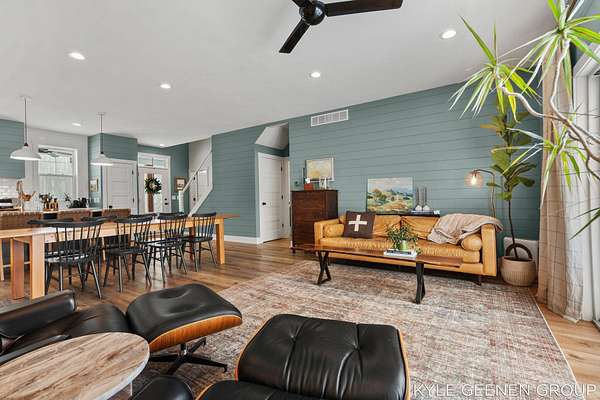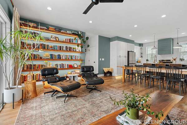 Step inside to an open light filled layout where expansive windows and high ceilings create an inviting and sophisticated atmosphere. The updated kitchen anchors the home featuring newer stainless steel appliances stylish countertops and a generous island perfect for hosting gathering and everyday living.