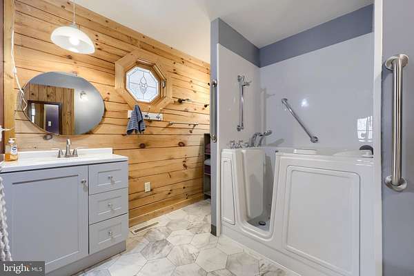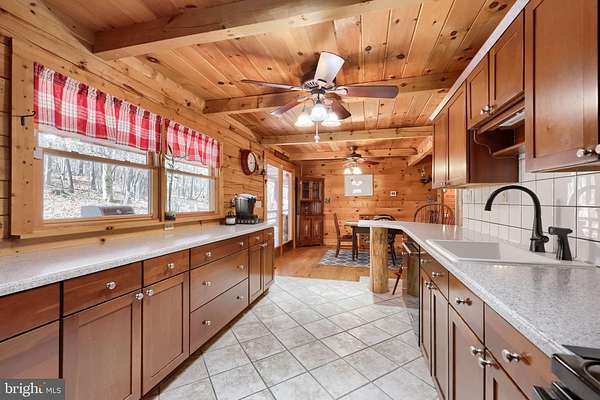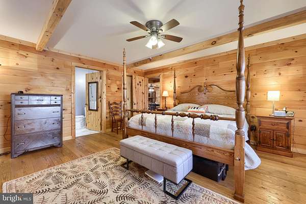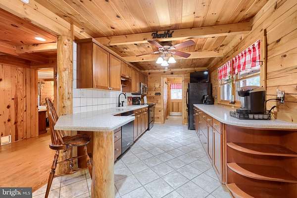 - Breakfast Area, Built-Ins, Ceiling Fan(s), Combination Kitchen/Dining, Country Kitchen, Dining Area, Entry Level Bedroom, Exposed Beams, Family Room Off Kitchen, Jetted Tub Bathroom, Open Floor Plan, Primary Bath(s), Recessed Lighting, Stall Shower Bathroom, Table Space Kitchen, Upgraded Countertops, Walk-In Closet(s), Walk-In Shower Bathroom, Wood Floors, Wood Stove