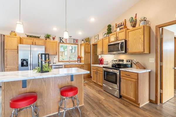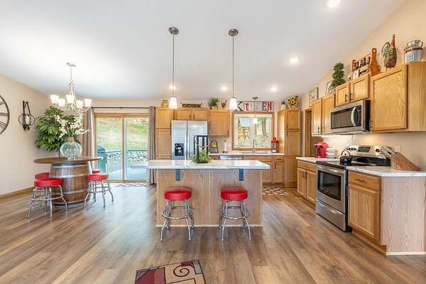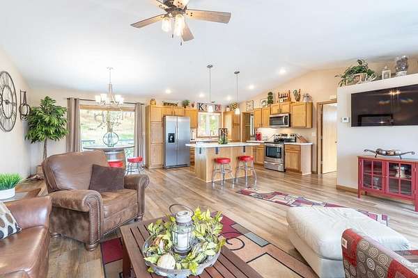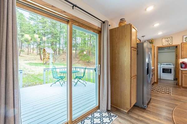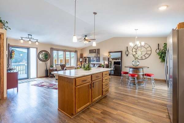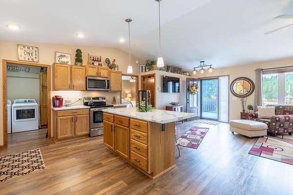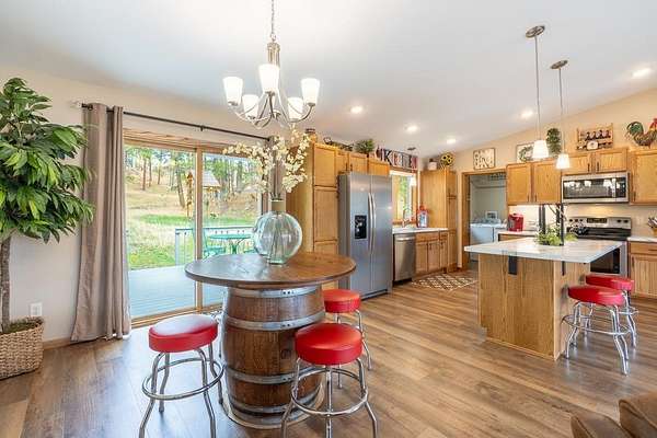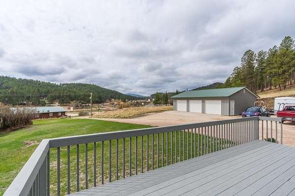 UNLIMITED POSSIBILITIES! Uncover this rare 3.03-acre property within city limits, bordering US Forest Service land—offering the perfect blend of convenience & seclusion. The beautifully renovated, open-concept main level living home is full of charm & features high-end finishes throughout. Sun-splashed kitchen boasts a movable center island & commercial-grade luxury vinyl tile wood flooring that extends into the dining area & living room w/ vaulted ceiling. Step outside & unwind on the inviting decks, where you can soak in peaceful views & frequent wildlife sightings. Optimal set-up for adding on beds & bath on the west or east sides. A brand-new 38x26 3-stall garage with an 11x36 concrete apron provides ample space for vehicles, toys, or a workshop. An original homestead structure remains on the property, currently used for storage & full of potential. Extensively updated with long-term living in mind, the home boasts added insulation, a new furnace prepped for central air, and numerous improvements for low-maintenance living. With neighboring commercial properties, there may be potential for additional uses such as cabins or investment opportunities (buyer to verify). The property could also be suitable for short-term rental, subject to local regulations. Enjoy the best of both worlds—peaceful, country-like surroundings just seconds from downtown Hill City’s shops, dining, and attractions. A truly special opportunity in one of the Black Hills’ most sought-after locations!