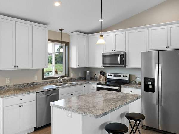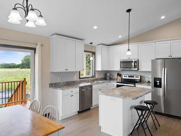 A bright, open-concept layout features vaulted ceilings in the living room and seamless flow into the dining and kitchen areas-- perfect for entertaining or everyday living. The dining area includes a walkout to a spacious back deck with stairs leading to the backyard, ideal for soaking in the views or hosting summer gatherings.