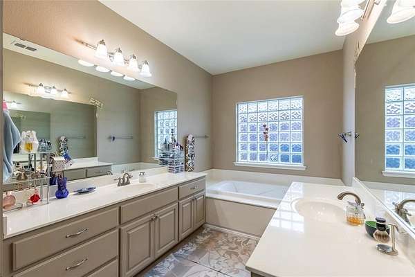 The primary suite features dual sinks, a jetted tub, and a separate shower. A large bonus room with an attached bathroom could easily be used as an in law suite, guest space, or additional living area. The home also offers generous storage throughout.