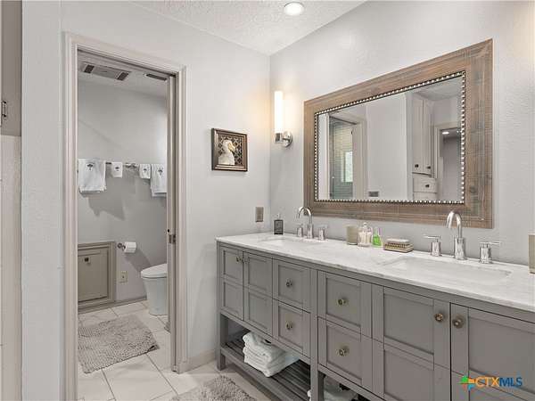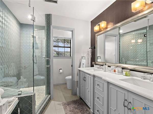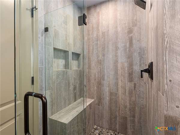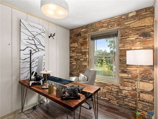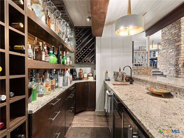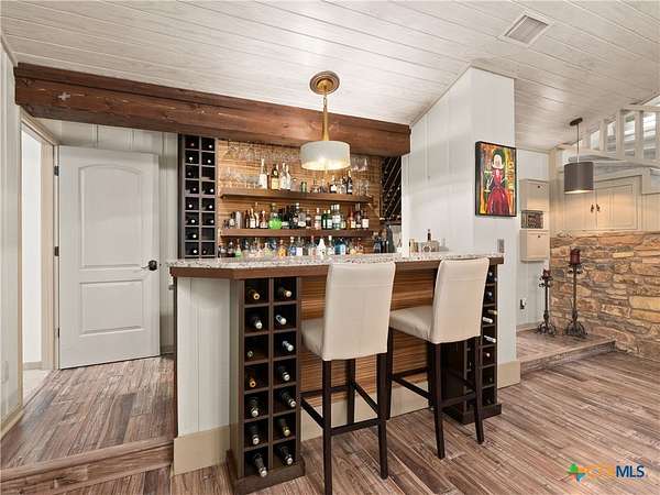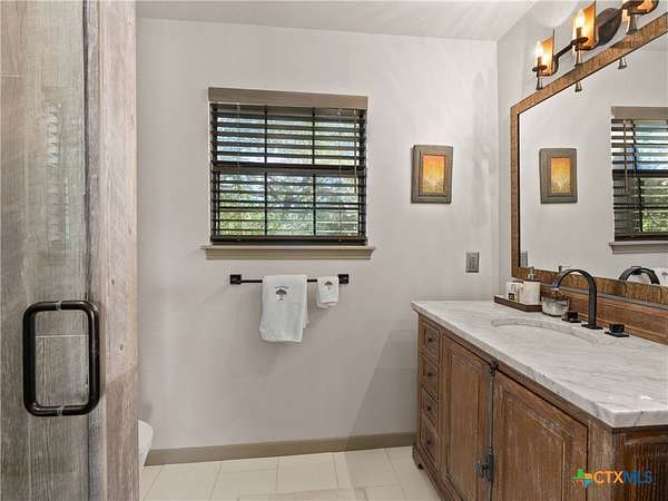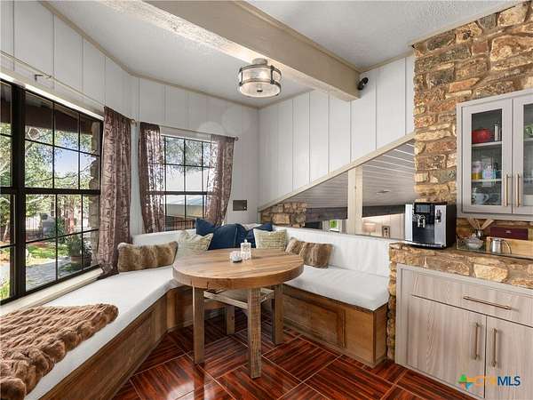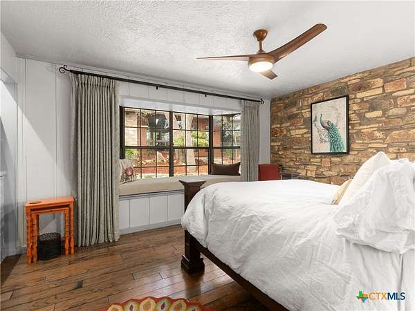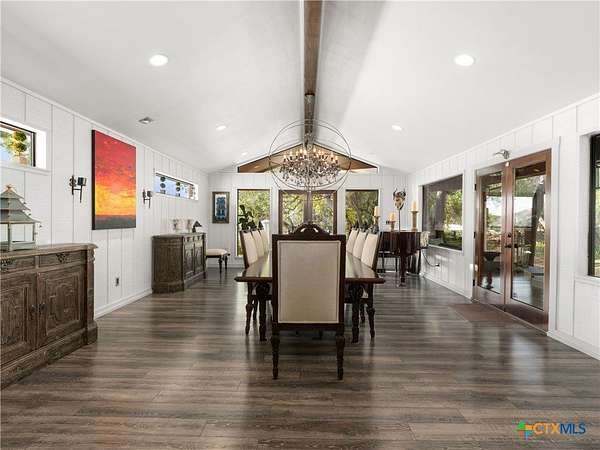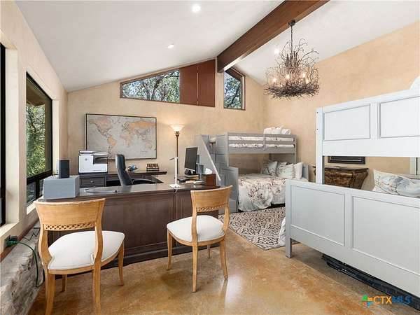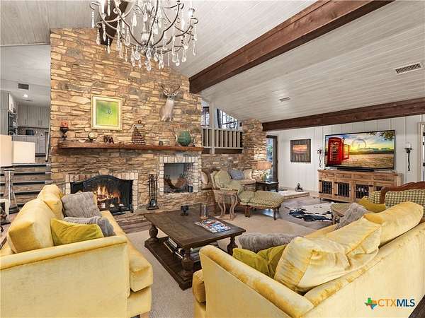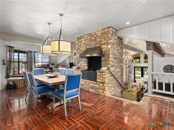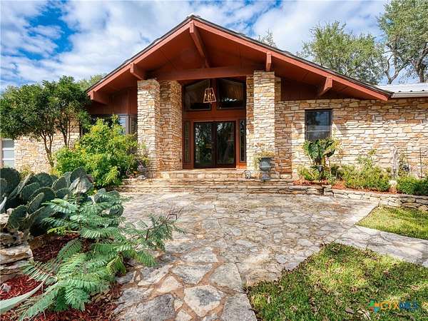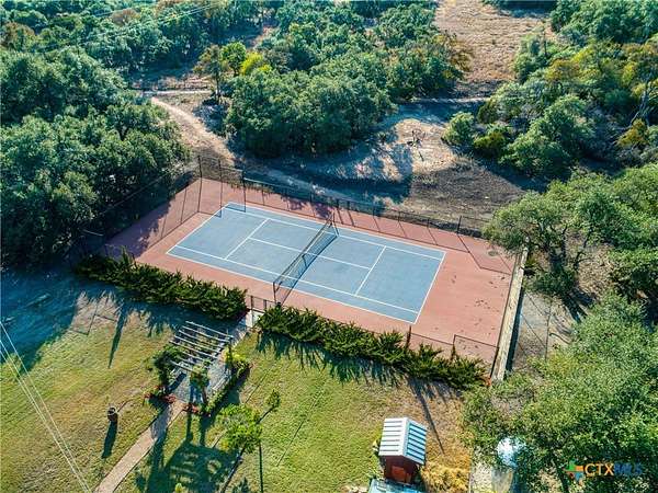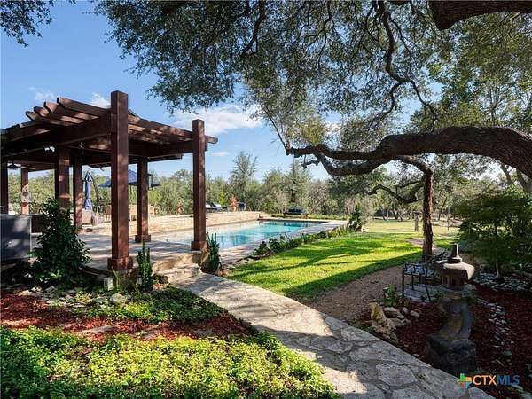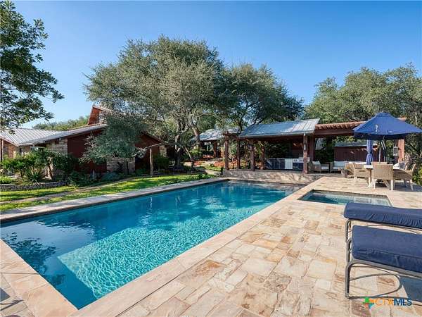 Set high along the ridge of the Devil's Backbone, this 31-acre Hill Country estate spans two lots and blends resort-style amenities with timeless stone architecture and thoughtful updates throughout. A private, tree-lined drive leads to the 5,043 sq ft main residence and 1,650 sq ft guest house, totaling 6693 living space, and together offering 6-7 bedrooms, ideal for hosting amazing gatherings of any size. Inside, the main home features vaulted/beamed ceilings, stone walls, and multiple fireplaces that create warmth and ambiance throughout. The chef's kitchen includes dual dishwashers, ovens, and refrigerators, a grand stone fireplace, and a dining area large enough for large gatherings. The spacious primary suite serves as a true retreat with its own fireplace and serene Hill Country views. Outdoors, enjoy a 40'x20' pool with spa, covered outdoor kitchen with lounge, and multiple terraces designed for entertaining. A mile-long walking trail encircles the property and leads to a natural five-room cave recorded with the Texas Spelunking Society. Additional amenities include a tennis court, pond with waterfall, greenhouse, aviary, and a 40x40 barn easily convertible to horse stalls. Recent updates include a full-house generator, new well pump, septic, and sprinkler systems. An adjoining 11 acres is available for purchase, offering the opportunity to expand this exceptional estate into a 42-acre Hill Country retreat.