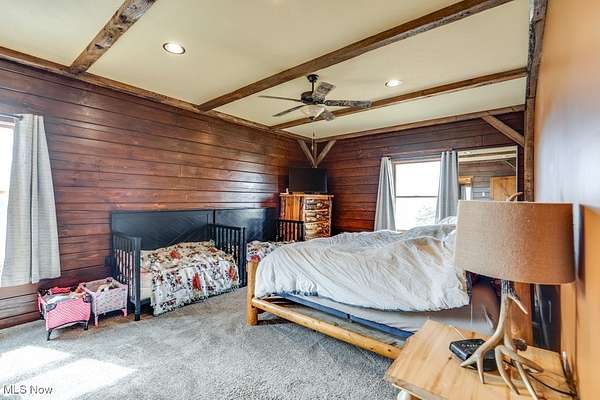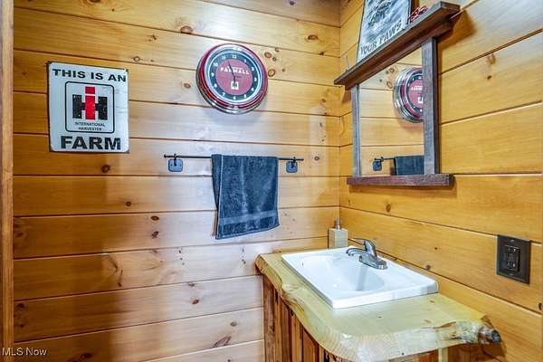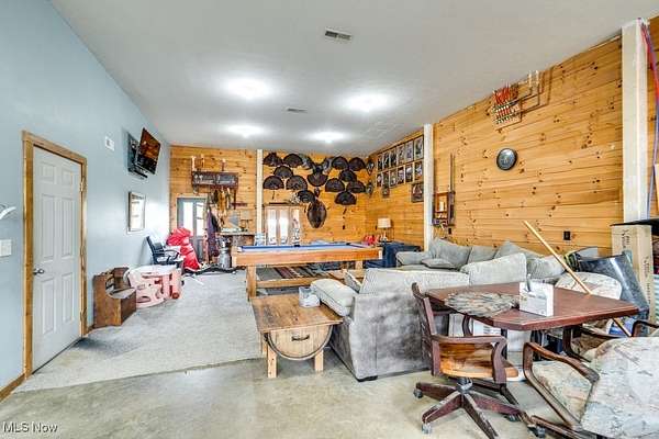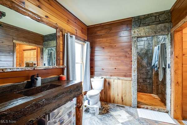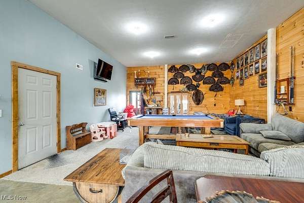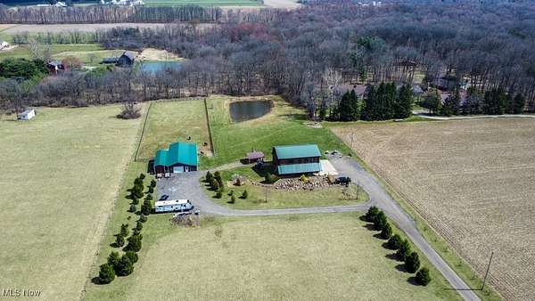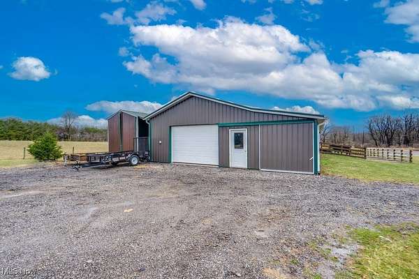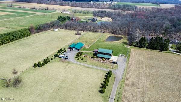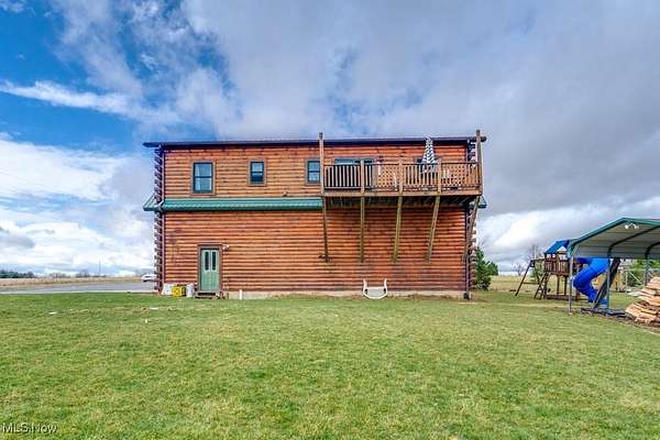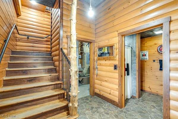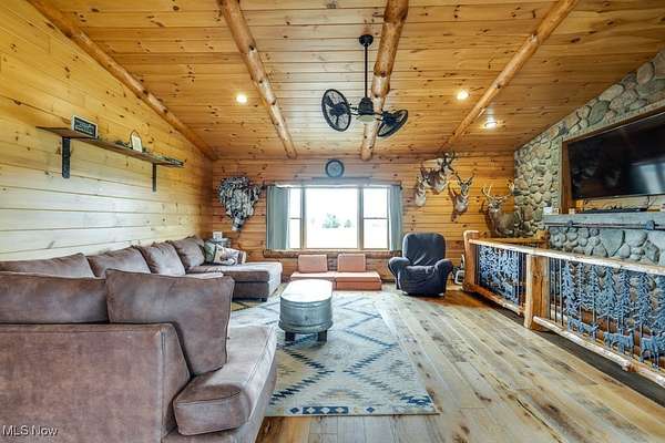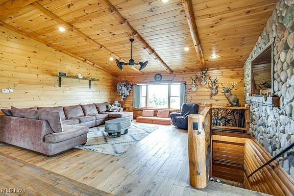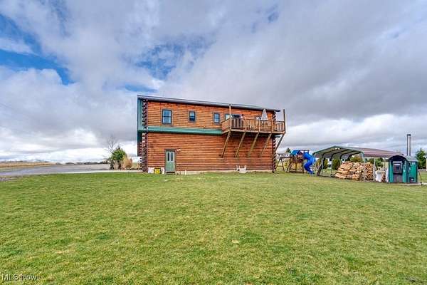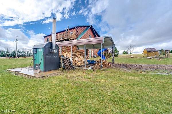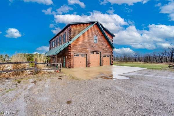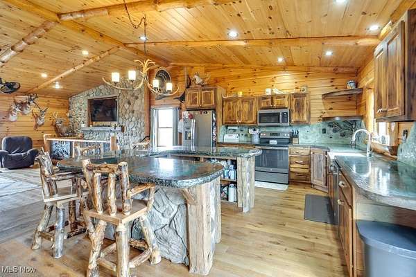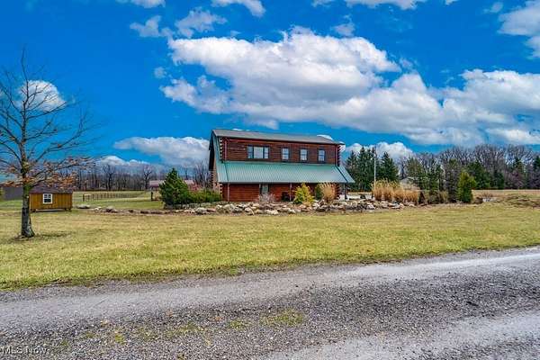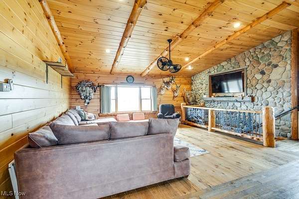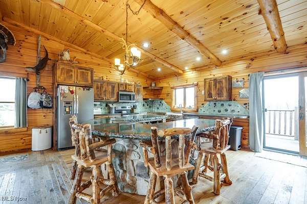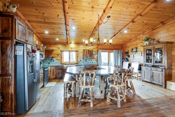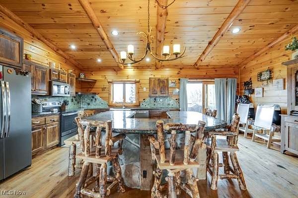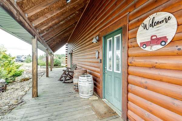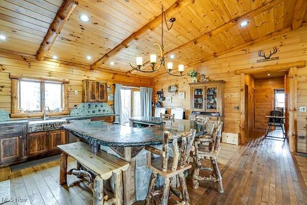 This stunning 2,600 sq. ft. log home combines rustic charm with modern amenities. Situated on 6.86 acres, this property features a spacious open floor plan that creates a warm, welcoming atmosphere. The heart of the home is the kitchen, equipped with top-of-the-line stainless steel appliances, beautiful American Chestnut cabinets, and unique cement countertops. A half-circle island serves as a central gathering place, perfect for meal prep or casual conversations. The home is designed for comfort with radiant heat throughout, including the spacious 24 x 64 outbuilding with enclosed 10 X 64 lean-to that also has water access and is heated. The walk-out back deck, measuring 22 x 8, overlooks the serene pond, offering a tranquil retreat. Inside, the master bath features an impressive 8 x 4 cement shower, and custom log furniture complements the rustic feel of the home. For those with additional needs or projects in mind, there is the potential to add a few rooms off the oversized 3-car garage. The property also features a 12 x 42 camper carport, and a pasture ideal for animals, providing ample space for livestock or recreational activities. The oversized garage offers plenty of room for storage or vehicles, and with the radiant heat, it's usable year-round. The outbuilding's 10-foot-high ceilings provide generous space for workshops, storage, or other purposes. The front yard was reseeded in the fall of 2024. This home truly brings together the beauty of natural wood with modern luxury, making it an ideal retreat or family home.