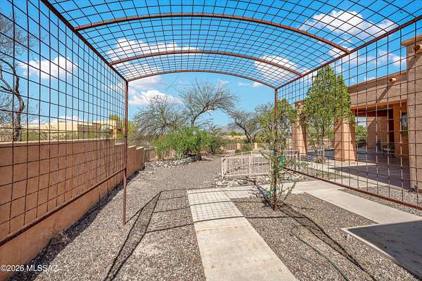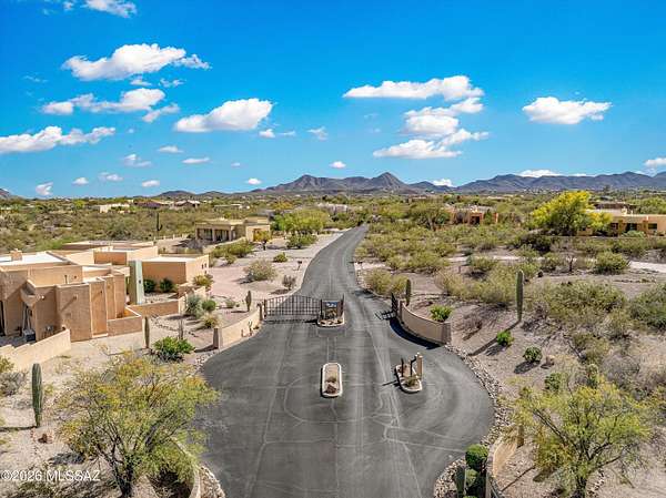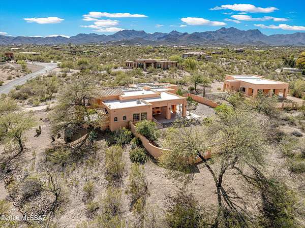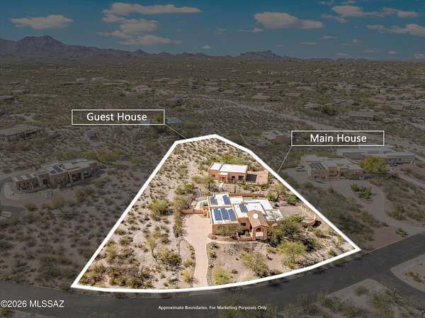 Unique estate in gated community on 1.7 acres with guest house, privacy, Owned Solar, outdoor Sauna, and sweeping mountain views. Nestled within a secluded gated enclave on Tucson's desirable west side, this exceptional property offers the rare blend of serenity, security, and expansive desert beauty that discerning buyers seek. The Main residence, built in 2004, features 4 bedrooms, 3 baths, and a spacious 3-car garage, while an approximately 600 sq ft L-shaped covered patio opens to a large walled backyard with captivating Mountain and City views. Designed for both refined living and effortless hosting, the 1,451 sq ft guest house, built in 2011, includes 2 bedrooms, 1.5 baths, an expansive covered patio, and its own private walled yard--ideal for guests, multigenerational living, home office and gym, or an inspiring retreat space. Peaceful surroundings, generous separation between the residences, and scenic mountain vistas create a true sense of wellness. Thoughtfully enhanced with OWNED SOLAR, and 2 rainwater catchment systems that support the lush desert landscaping year-round, this property offers comfort as well as efficiency. Tucked in an upscale, private neighborhood with quick access to I-10, this is a rare opportunity to enjoy secluded luxury living without sacrificing convenience.