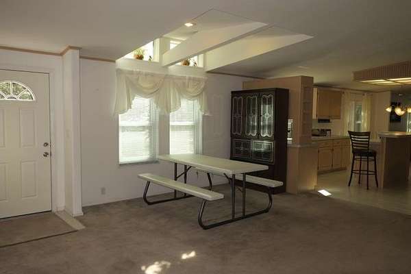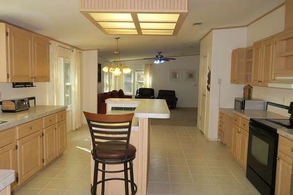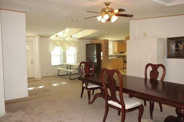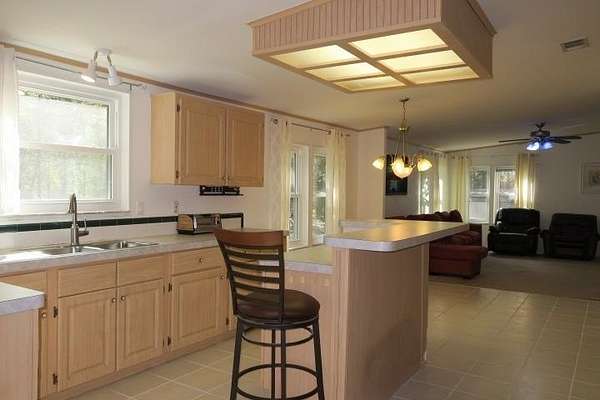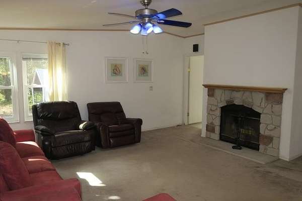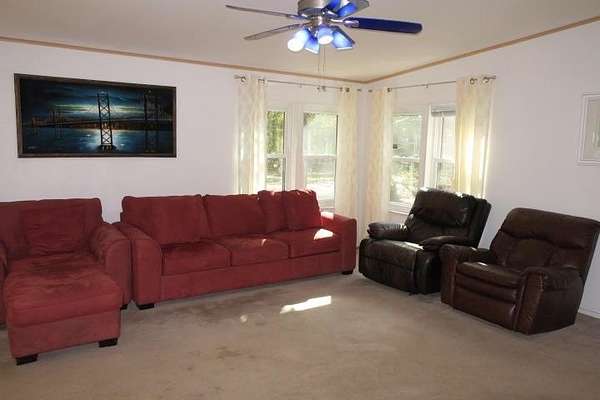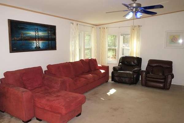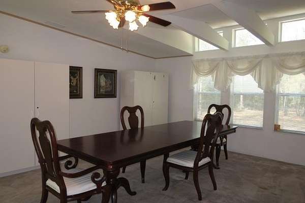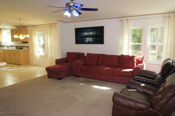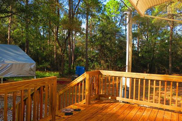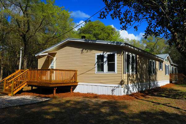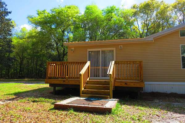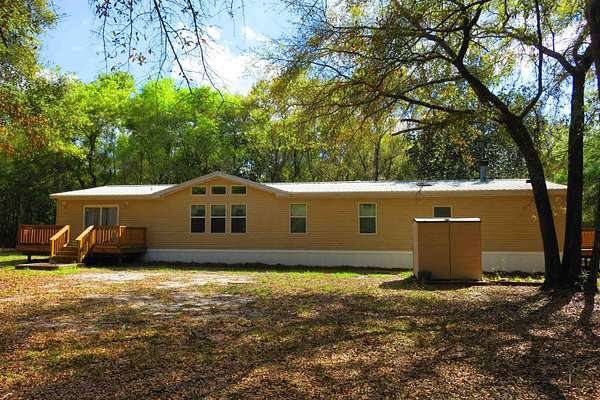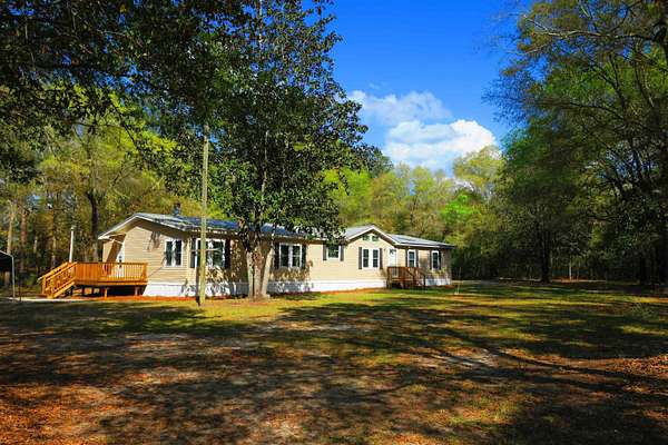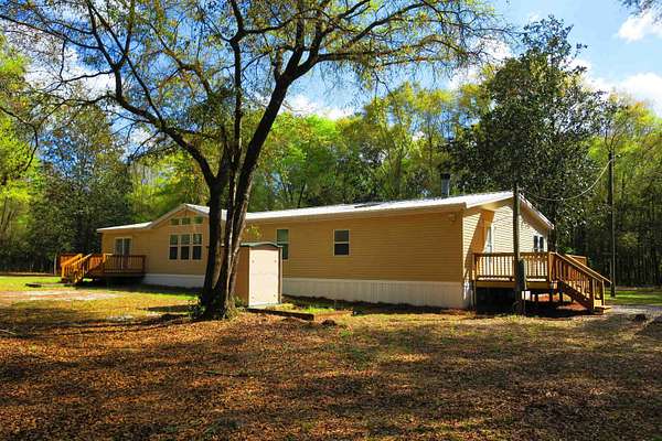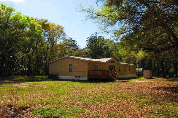 Incredible Palm Harbor home nestled on over four acres in tranquil Talquin Springs, one block away from access to gorgeous Lake Talquin. Palm Harbor homes are known for their quality builds and this one clearly shows it with solid construction and style. Awesome open floor plan, large family room with wood burning fireplace with stone, cove molding in the common areas and primary suite, enormous living room and dining area both including elevated ceilings with beams and transom windows creating an abundance of natural light in the home. Huge eat-in kitchen with breakfast nook, center island with bar, ample amount of cabinets and counter top space, pantry and a computer nook. Generous primary suite with massive walk-in closet and luxury bath with large garden tub, dual vanities, water closet, separate shower and linen cabinet. AC 2023, windows 2017, corrugated metal roof @2017/2018, two storage sheds and brand new front door with storm door. Hang out on the brand new decks and enjoy outdoor times overlooking the nice, flat private acreage with a happy balance of sun and naturally wooded areas for shade that even the deer love. The home is set well in the back of the property to create a quiet, serene setting on a nice flat yard. One block away is Luther Hall Landing with boat ramp, camping ground, restroom, picnic area and water fountain on huge and picturesque Lake Talquin, a true retreat for water enthusiasts and offers excellent fishing.