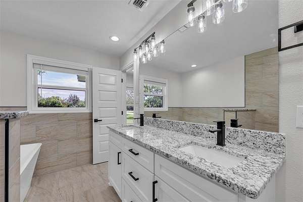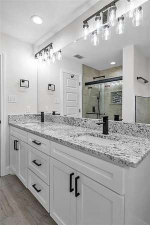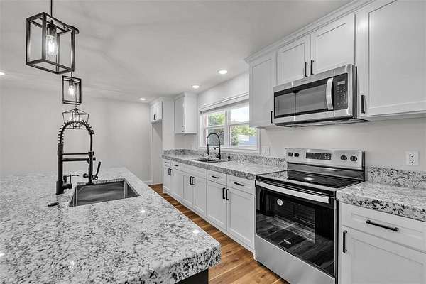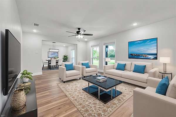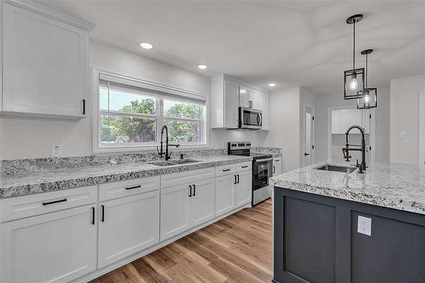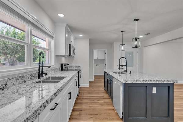 Step inside to a light and bright open floor plan featuring luxury vinyl plank flooring, fresh paint, updated fixtures, and a modern, farmhouse-chic design throughout. The spacious kitchen is a dream with stainless steel appliances, new countertops, ample cabinetry, and a large island overlooking the living area.