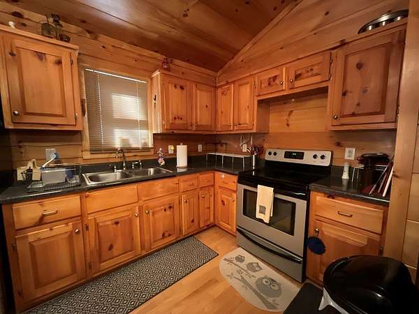 Secluded log cabin nestled in a wooded setting, yet conveniently located just minutes from everyday amenities. This 2-bedroom, 1-bath retreat offers an open-concept living room and kitchen with vaulted ceilings and hardwood floors throughout. A gas-log fireplace provides a warm focal point, while the 280 sq ft covered deck offers the perfect place to relax and enjoy the surrounding mountain breezes. A small creek runs through the property, which also features a small pond, storage shed, and detached carport. Wildlife is frequently observed in the area. The location provides easy access to Exit 8 and Exit 14 off Interstate 77 and is approximately 5 miles from the Blue Ridge Parkway, Crooked Creek Wildlife Area, and the Blue Ridge Music Center.