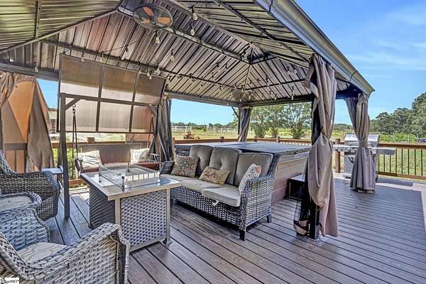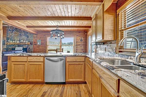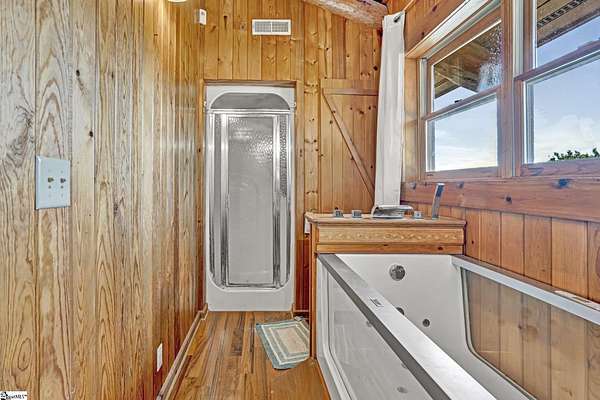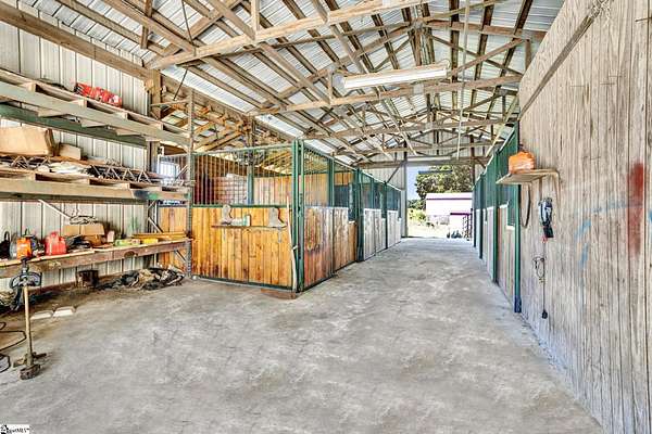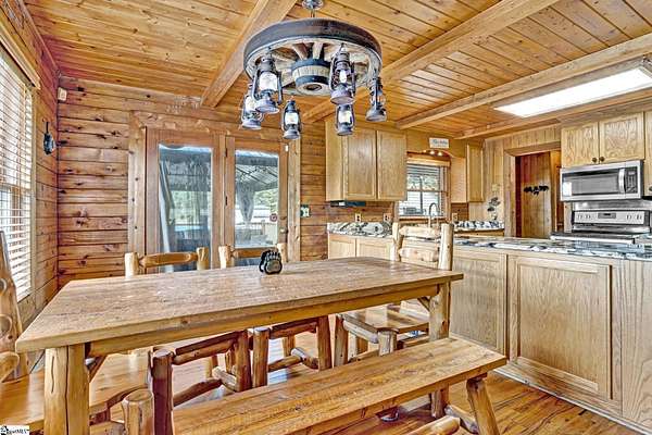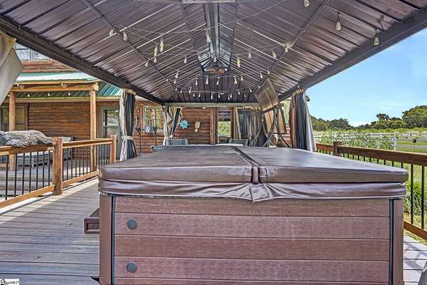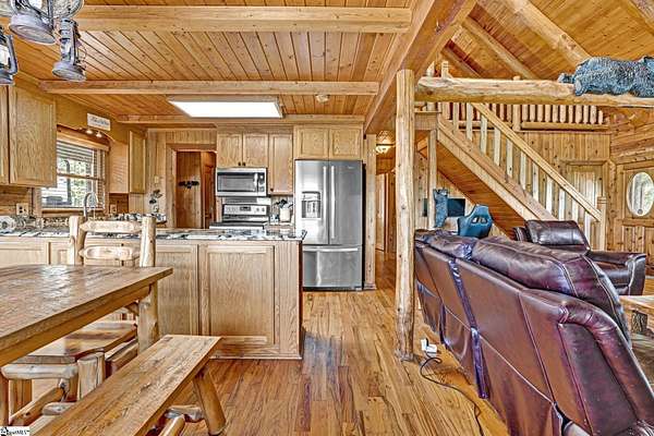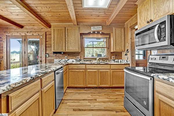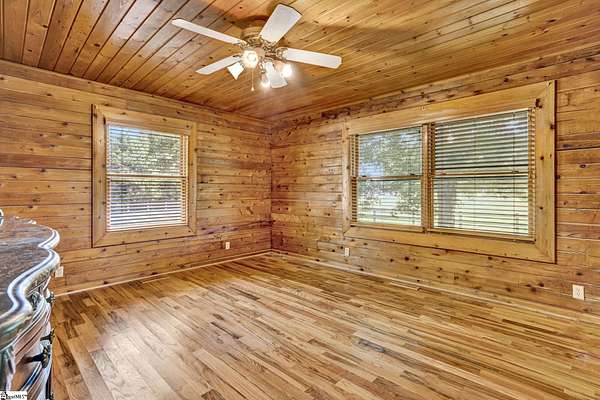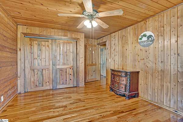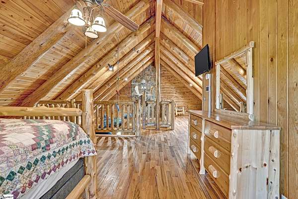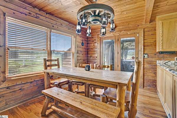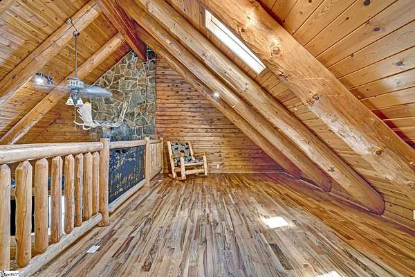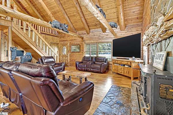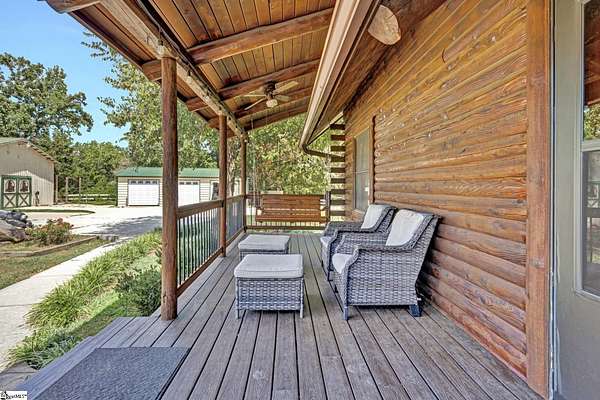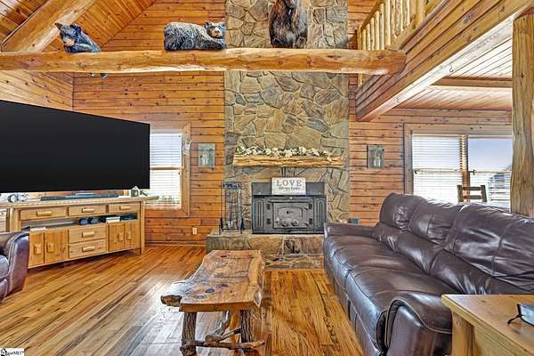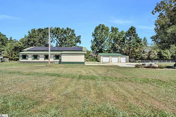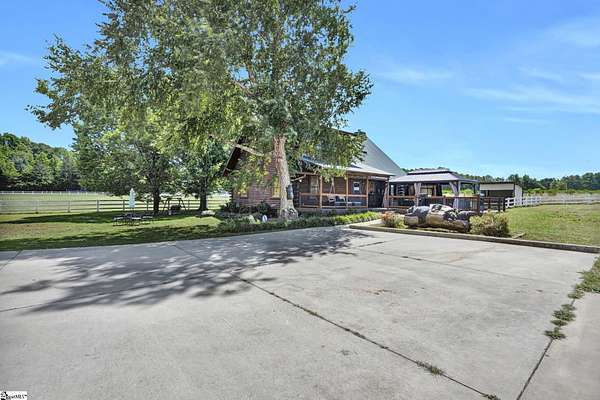 Home being Sold As-Is. Welcome to 313 Henderson Rd in Gray Court, SC—a modern rustic retreat set on approximately 5.92 acres of level, pasture-like land with a standing pond. This custom log-style home offers 3 bedrooms, 2 full baths, and approximately 2,060 sq ft of charming, energy-efficient living space. The property features excellent parking and storage, including a detached 3-car garage and an additional 1-car garage attached to the barn, providing ample space for vehicles, equipment, or hobbies. With 40 owned solar panels powering the home, barn, and detached garage, electric costs are nearly nonexistent. Inside, you’ll find vaulted ceilings, wood floors, granite countertops, and insulated windows. The cozy living room showcases cathedral-style vaulted ceilings and a wood stove, while the kitchen includes an electric cooktop, built-in microwave, and a bright breakfast nook. The spacious upstairs primary suite is a true retreat, featuring a jetted tub and a walk-in closet. Outdoor living shines with covered front and back porches, a hot tub, and a barn/stall plus multiple outbuildings, all equipped with electric and water—ideal for a mini-farm or hobby homestead. The standing pond adds to the property’s peaceful, country setting and usability. Zoned for Gray Court-Owings schools and Laurens District 55, this unique property offers privacy, sustainability, and versatility. Schedule your private showing today.