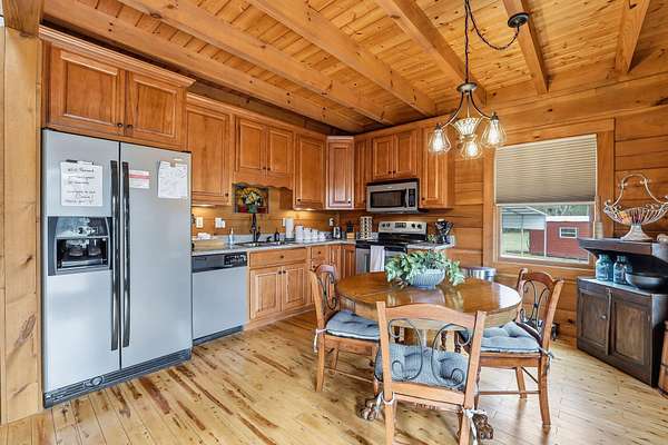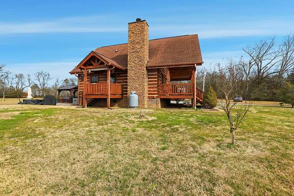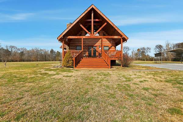 Set on 27 private acres with half a mile of creek frontage, this fully furnished short-term rental property offers a rare combination of lifestyle appeal and income potential. The log cabin blends rustic character with modern comfort, featuring vaulted wood ceilings, exposed beams, an open-concept living and kitchen area, and a versatile loft space ideal for additional sleeping or lounging. The home also includes floored attic storage with two 12x4 storage rooms, providing valuable owner storage for STR operations.