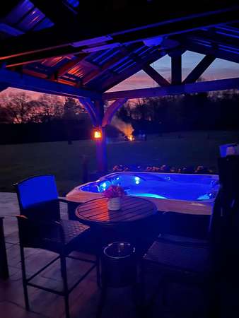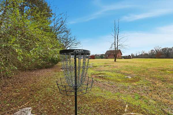 Outdoor amenities elevate the guest experience and support strong rental demand. A 30x30 patio with gas BBQ creates an ideal gathering space, while a stone walkway leads to a dedicated fire pit area for evenings outdoors. Guests can enjoy the on-site disc golf course, explore the expansive acreage, and relax along the creek, making the property well suited for weekend getaways, group stays, and experience-driven rentals.