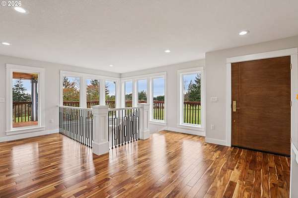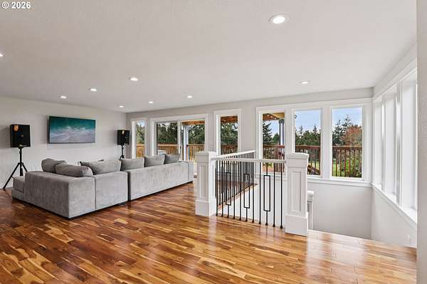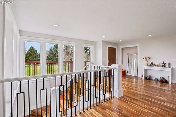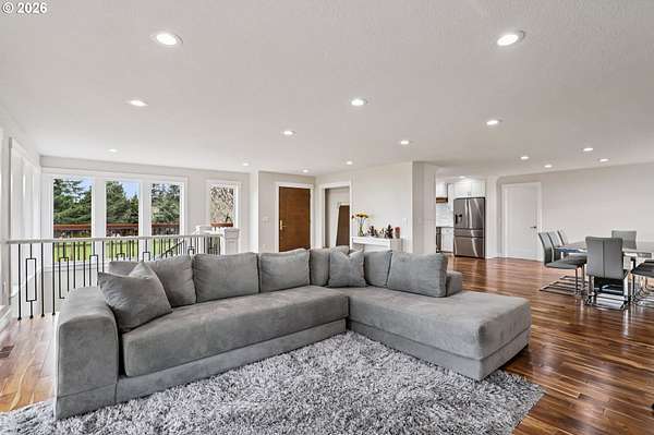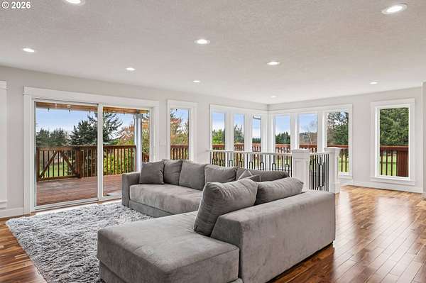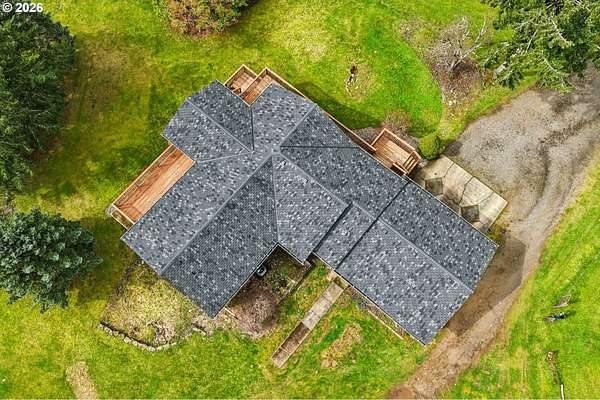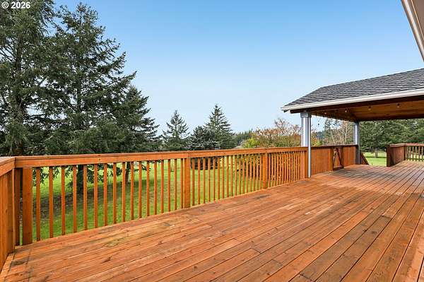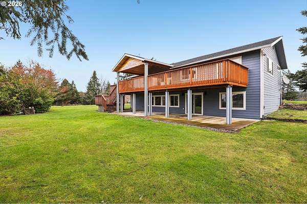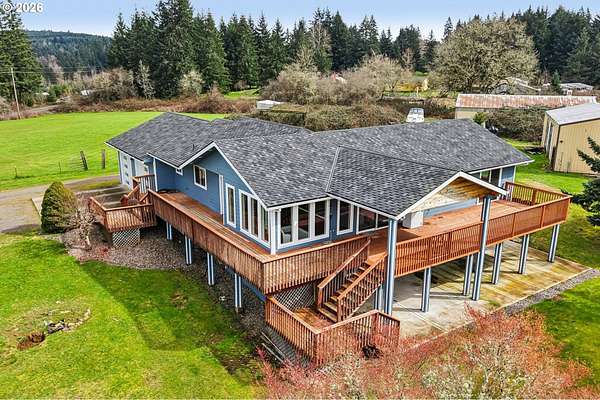 Beautifully designed home with exceptional space both inside and out. Ideal horse property, including 2 tax lots totaling 7.43 acres. Welcoming wrap-around deck opens to great room family room, windows frame sweeping territorial views of surrounding property, sliding door access to covered deck, creating seamless indoor-outdoor living. Gourmet stainless kitchen well-appointed with some Dacor appliances. Granite countertops and marble tile backsplash complement abundant shaker-style soft-close cabinetry, some with glass panes and pull-outs, plus open shelving. Adjacent to kitchen is the dining area. Main-level primary en-suite offers deck access, and spacious walk-in closet with California Closet organizer. Luxurious bath includes a dual vessel sink granite floating vanity, frameless shower with marble tile up to ceiling, private water closet. Second bedroom and full bath are also located on the main. Lower level expands living space with two additional bedrooms, fifth non-conforming bedroom ideal for media room/office, huge bonus room pre-plumbed for wet bar, abundant windows with territorial views and slider access to covered patio. Additional conveniences include 2 laundry rooms, one fully equipped on the main with built-ins and granite counters, another on lower level pre-plumbed with washer and dryer. Interior highlights: All appliances remain, floating vanities in all bathrooms, granite countertops, hardwood, marble tile and carpet flooring, recessed lighting, 80-gal hot water heater. Hughes Network internet available. Outdoor amenities: wrap-around deck, covered patio, oversized two-car garage, new Hardi Plank siding, new 50-year roof. Substantial shop of approx 1800 sq ft plus a 300 sq ft loft, electricity, security lighting, concrete floor, two tall garage doors, and mechanics service pit. 30x60 pole barn, electricity, security lighting, previously housed five stalls. Four cross-fenced pastures. Mortgage savings may be available for buyers of this listing.