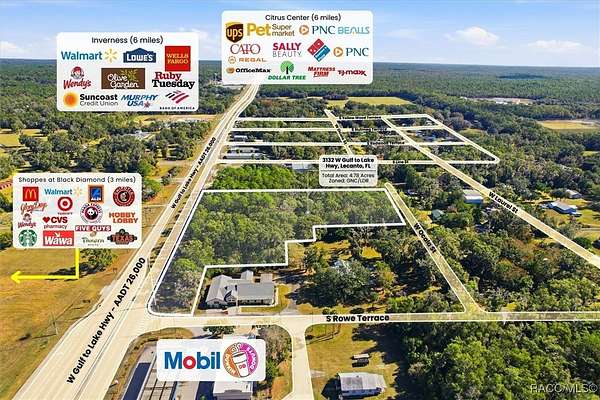 NOW IS THE TIME! This prime 4.78-acre property offers an exceptional opportunity to develop your business in the heart of Citrus County. Located less than 3 miles from the Suncoast Parkway, it sits directly on the path of growth and provides 600 feet of highway frontage along Gulf to Lake Highway, near the intersection of 491/Lecanto Highway. This strategic positioning ensures maximum visibility and exposure for any commercial venture, with a daily traffic count of 26,000. The front portion (2.6 acres) of the property is zoned General Neighborhood Commercial (GNC), while the back section (2.18 acres) is zoned Low Density Residential (LDR), offering flexibility for a variety of uses. GNC zoning uses can include retail plazas with tenants for nail salon, coffee shop and insurance offices, drive-thru restaurants or EV charging stations, medical or professional offices, financial institutions, assisted living or memory care care facility, car wash, or Hotel. Its central location places Inverness just a few miles to the east and Crystal River a few miles to the west, making it a convenient hub within the county. Lecanto has experienced remarkable commercial expansion in recent years, highlighted by the opening of the Black Diamond Shoppes, which feature major retailers such as Target, Aldi, Sketchers, and Hobby Lobby, along with popular restaurants including Texas Roadhouse, Panda Express, Panera, and Glory Days Grill-all less than three miles away. Surrounding residential growth further enhances the area's appeal, with established communities like Black Diamond Ranch, Terra Vista, the newly opened Davis Reserve, and the planned 345-acre Crystal Ridge development, which will include 957 single-family home sites along with the Lecanto Preserve (less than 1/4 mile away), containing 30+ acres of proposed retail and out-parcels, as well as 838+ residential units, including single family homes and townhomes. With the ongoing expansion of the Suncoast Parkway providing a direct route to Tampa, Citrus County is poised for continued growth, making this property an outstanding investment for developers and business owners. Beyond its commercial potential, the county offers a rich cultural heritage, natural springs with world-famous manatees, scallop season, abundant water recreation, top-rated golf courses, and diverse dining experiences, making it one of the most desirable destinations on Florida's west coast. Don't miss out, call today!
