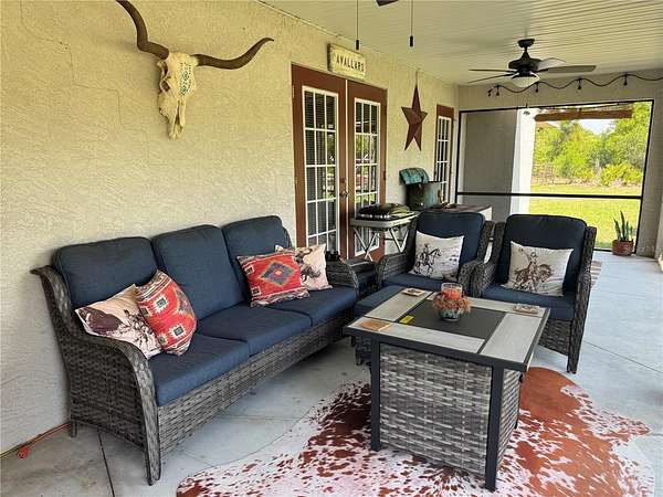 Morning light drifts across 3+acres, where quiet surroundings and room to roam create the kind of everyday escape that feels increasingly hard to find, all set in the highly sought after Washington Loop area of Punta Gorda. This versatile horse property offers a blend of country living and flexibility with no HOA and no deed restrictions, featuring a fully fenced and cross fenced layout, open pasture with water hook-ups, and a 24x48 barn with two 12x12 stalls, feed room, tack room, water service, and two 30 AMP hookups that lend themselves to a variety of uses from hobby farming to storage or workshop space. Dual entrances including one off Three Rivers Road provide easy access and added convenience for larger vehicles, trailers, or RVs. Nature and outdoor enjoyment are just moments away with over 3.5 miles of trails at Prairie Creek Preserve, offering a peaceful extension of right from your backyard. The 2003 built home is move in ready and well maintained with a 2021 roof, offering over 1,400 square feet with tile throughout the main living areas and a cozy wood burning fireplace that anchors the living room. The kitchen opens seamlessly to the dining and living spaces, while the spacious primary suite features an en suite bath with a large soaking tub for relaxing at the end of the day. Two guest bedrooms, a guest bath complete the interior of the home. Out back, life slows down in the best way. A large screened in porch where mornings start with coffee while soft breezes move through the screens and evenings settle into golden light spilling across the pastures, creating a quiet front row seat to the rhythms of country living. Located in Flood Zone X and just a short drive to downtown Punta Gorda, I 75, and the Punta Gorda Airport, this is a rare opportunity to enjoy space, privacy, and convenience all in one.
