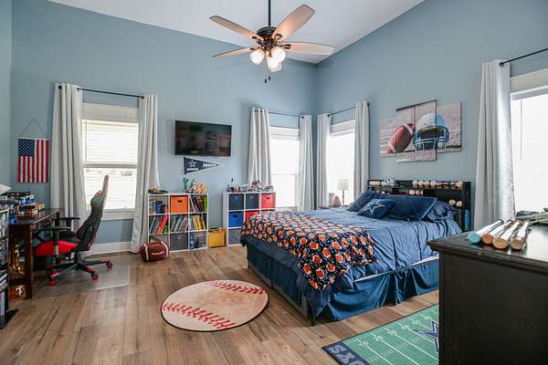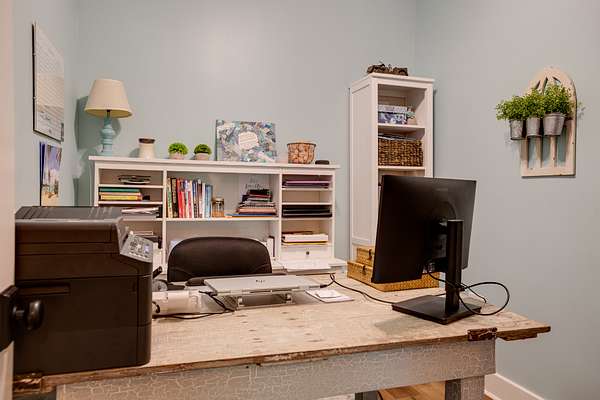 The kitchen is thoughtfully designed with custom cabinetry, quartz countertops, and stainless steel appliances, seamlessly connected to the great room and dining space. A private office with fiber internet provides a dedicated work-from-home setup without compromise.