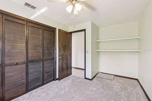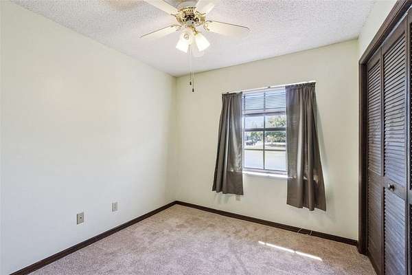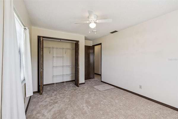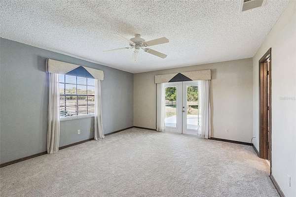 French doors open from the family room to a large, recently updated screened porch, leading to a fenced backyard—perfect for pets. The home is filled with natural light thanks to large French-style windows, complemented by blinds and thermal curtains. Main living areas feature neutral ceramic tile flooring, while all four bedrooms offer brand-new neutral carpet, spacious closets, and ceiling fans with lighting.