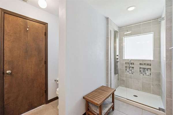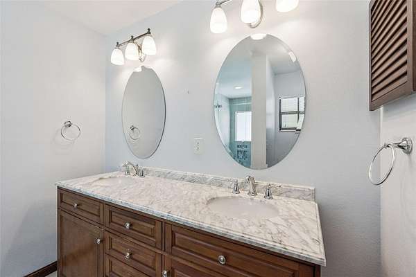 The primary suite is generously sized and includes his-and-her walk-in closets, new French doors to the pool deck, and an updated ensuite bathroom with double sinks, a furniture-grade vanity, and a custom glass-enclosed shower. The second bathroom has also been recently upgraded and features a 9-foot double-sink vanity with excellent storage.