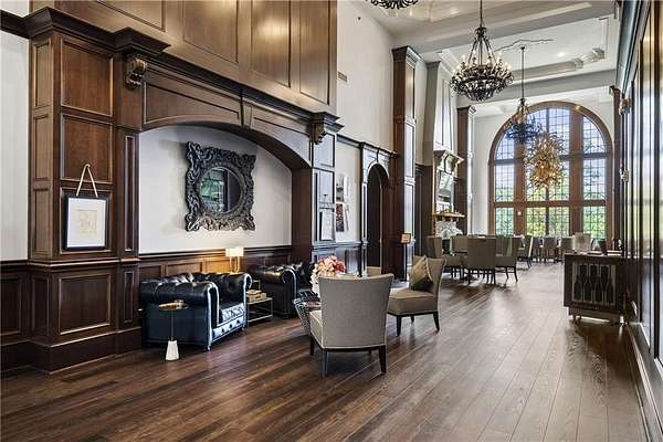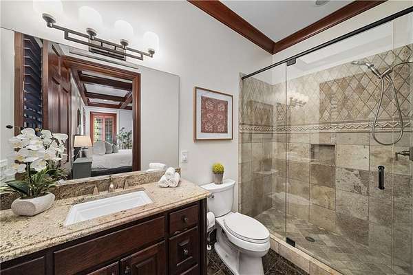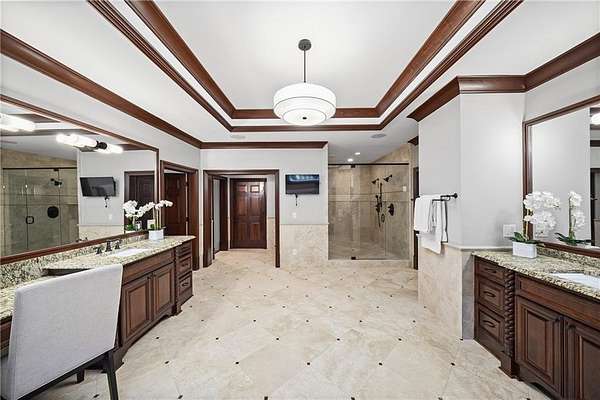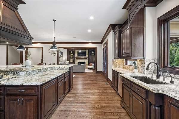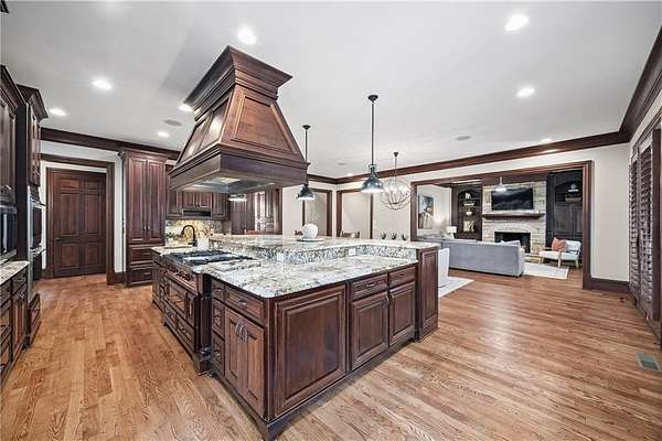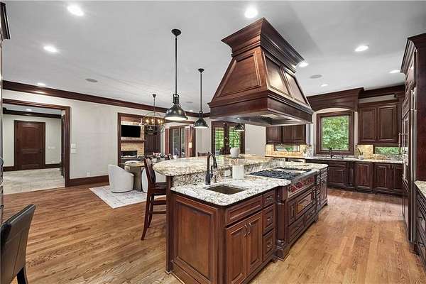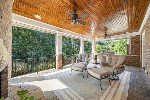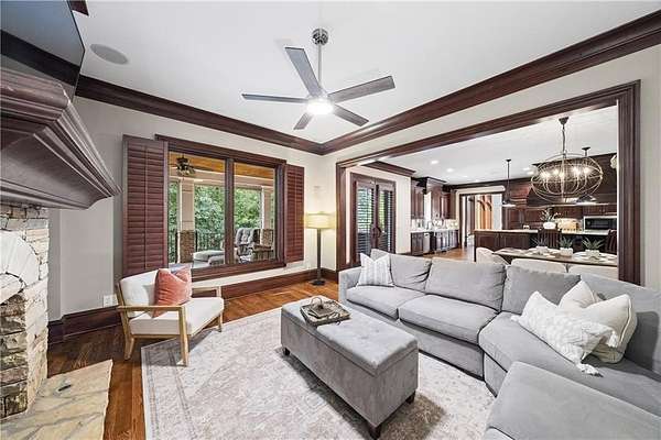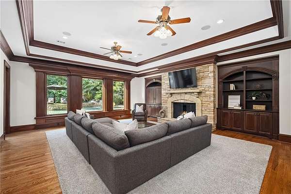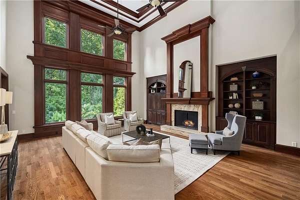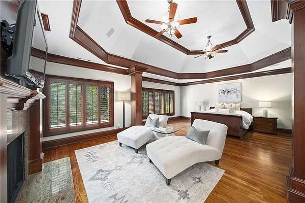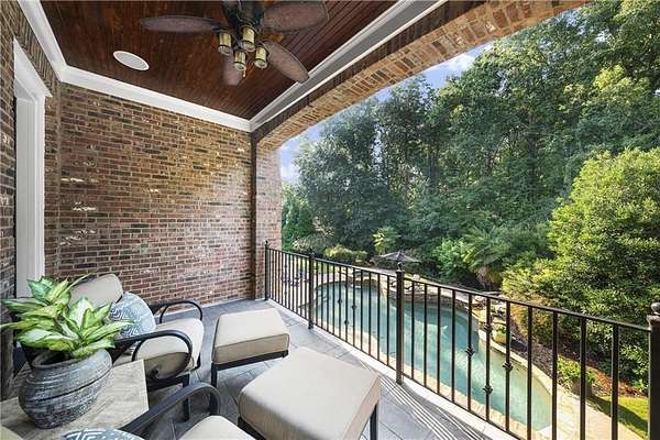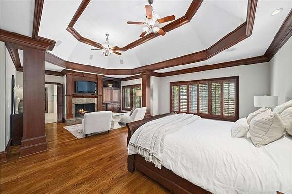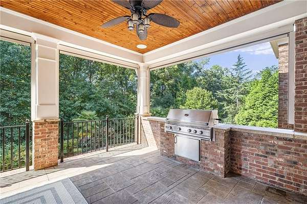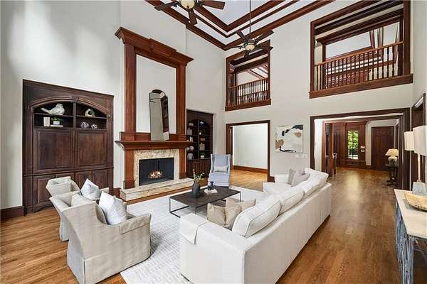 A two story foyer with a wraparound staircase opens to a great room with fireplace, built ins, and a wall of windows overlooking the backyard. A butler's pantry with ice maker, dishwasher, wine fridge, and warming drawer links the dining room to the chef's kitchen with a large center island, double ovens, stainless appliances, granite counters, and a fireside keeping room. French doors lead to a covered upper porch with built in grill, fireplace, and motorized sunscreens for year round use. An office, a sizable laundry near the mud area, and a main level guest suite with balcony and marble bath complete the floor.