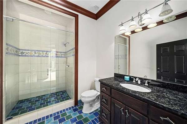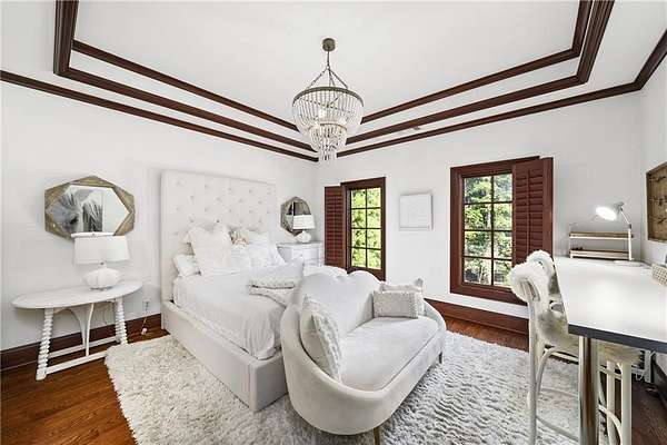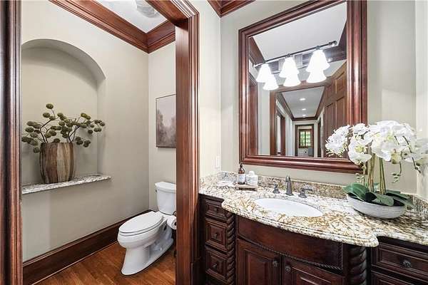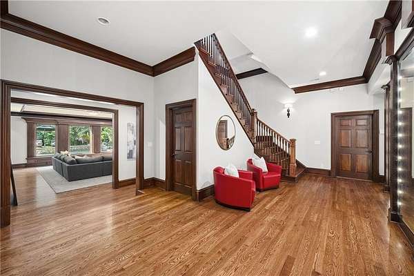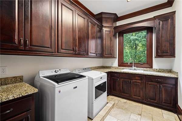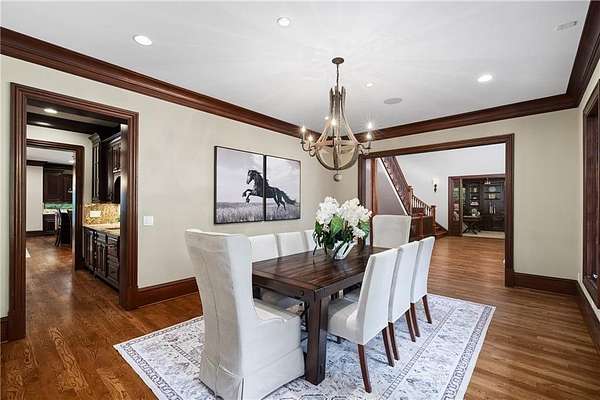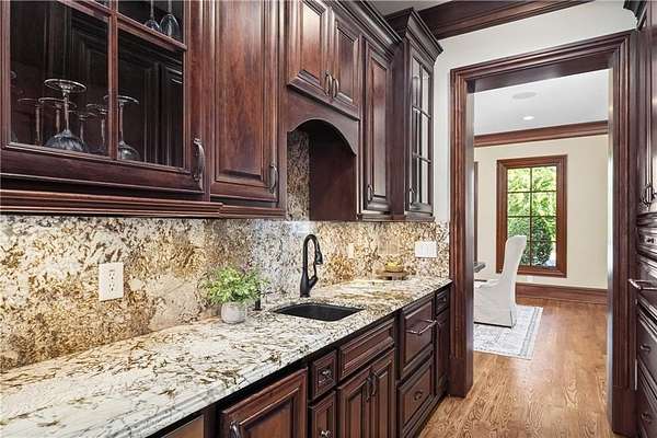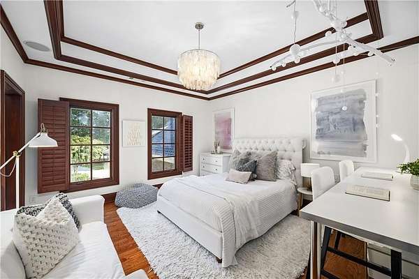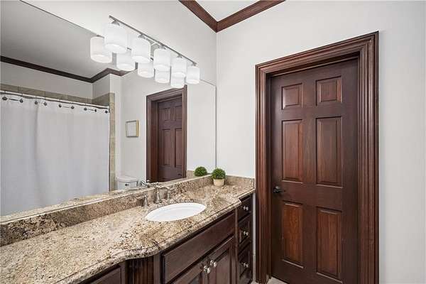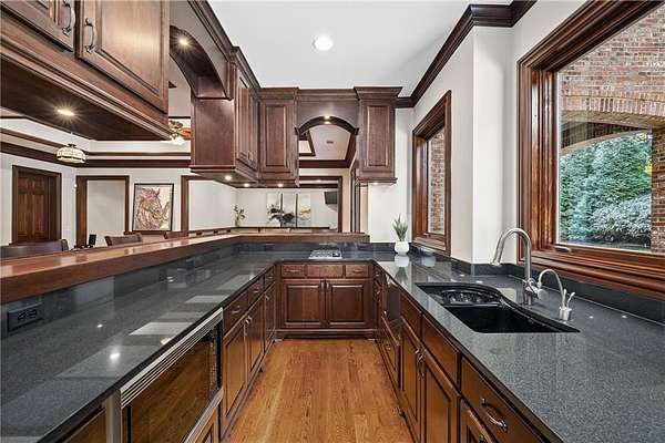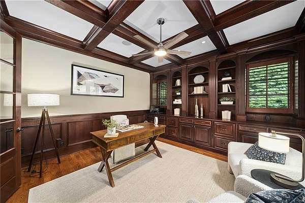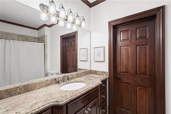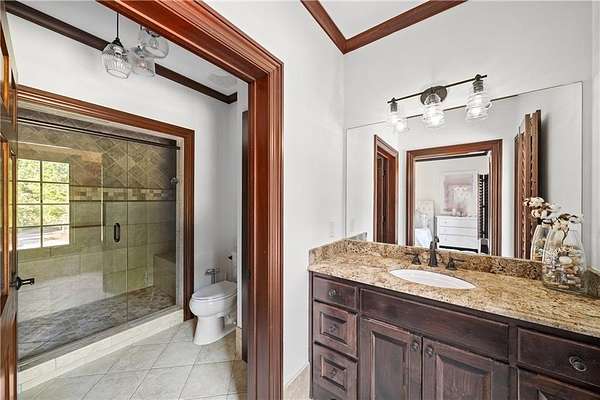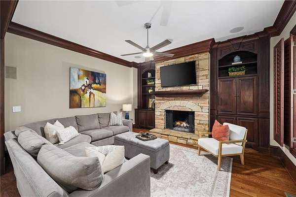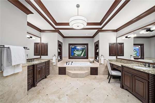 A two story foyer with a wraparound staircase opens to a great room with fireplace, built ins, and a wall of windows overlooking the backyard. A butler's pantry with ice maker, dishwasher, wine fridge, and warming drawer links the dining room to the chef's kitchen with a large center island, double ovens, stainless appliances, granite counters, and a fireside keeping room. French doors lead to a covered upper porch with built in grill, fireplace, and motorized sunscreens for year round use. An office, a sizable laundry near the mud area, and a main level guest suite with balcony and marble bath complete the floor.