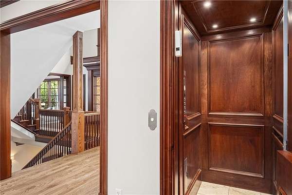 Notable systems and updates include an accessible elevator, whole house generator, central vacuum, whole house humidification and dehumidification, irrigation, and recent exterior improvements including new roof, new gutters, and freshly painted trim and doors.
