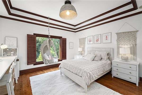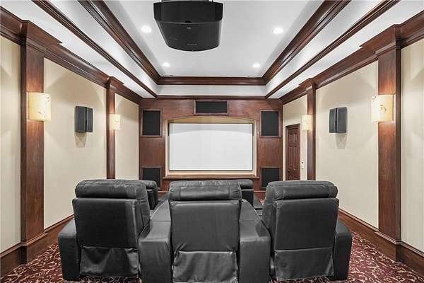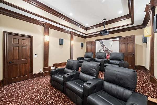 Upstairs, the primary suite features a fireside sitting room, two custom closets, and a spa bath with dual vanities, a jetted tub, and a spacious seamless glass shower with dual rainfall and handheld showerheads. Three additional en suite bedrooms and a laundry chute complete the upper-level.