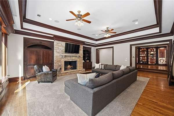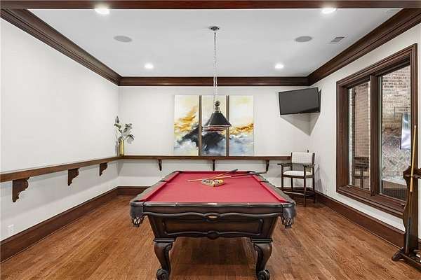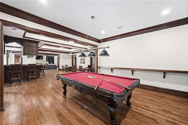 The terrace level adds a family room with stone fireplace, picture windows to the pool, a full second kitchen with wraparound seating, billiards and game space, a home theater, a storm shelter, and a guest suite with patio and pool access. Walk out to a heated gunite pool and spa with waterfalls, covered patio seating, and a dedicated pool bathroom, all set against mature landscaping and woods.