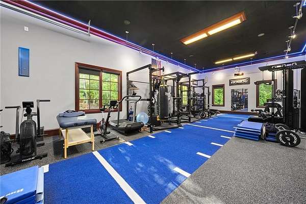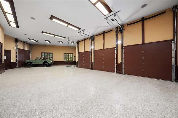 Exceptional parking and storage capacity with 9 garage bays across the main and terrace levels, plus a long motor court. A semi-detached outbuilding connected via covered breezeway originally designed for vehicle storage is now finished as a climate controlled gym with professional flooring, 15 ft ceilings, and oversized doors.