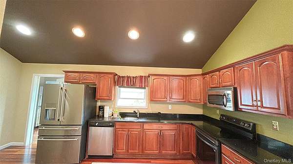Welcome to this inviting home offering both charm and convenience. Step inside to find a warm and welcoming layout featuring hardwood floors, elegant light fixtures, and a spacious kitchen with rich wood cabinetry, stainless steel appliances, and granite counters. The open dining area with vaulted ceiling and chandelier creates the perfect space for family gatherings or entertaining. Bedrooms are bright and comfortable, each offering plenty of natural light and storage.